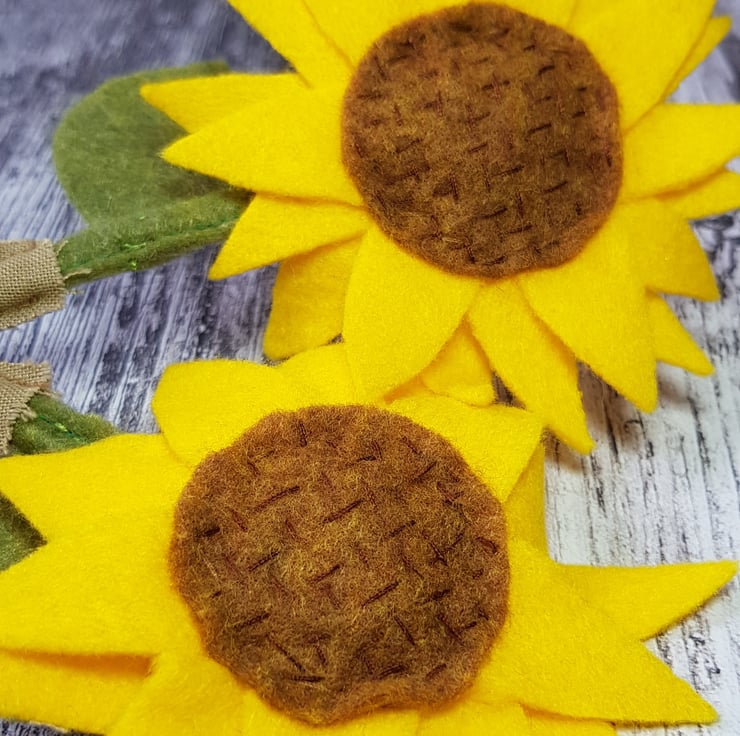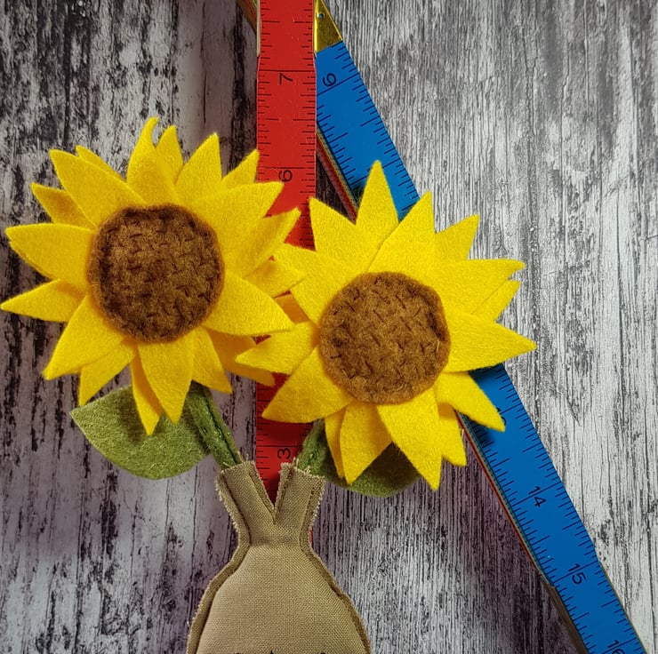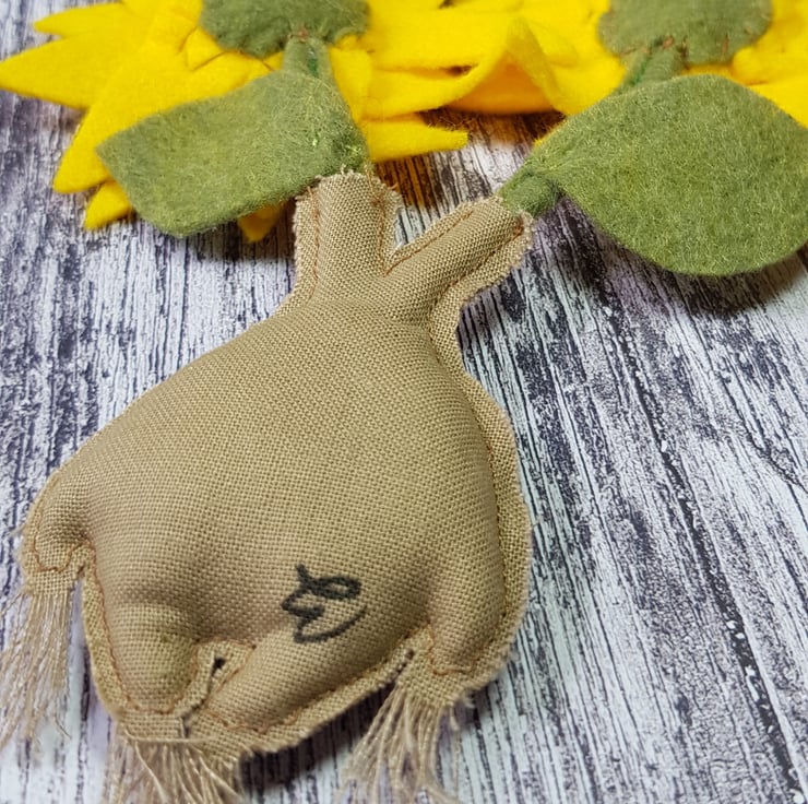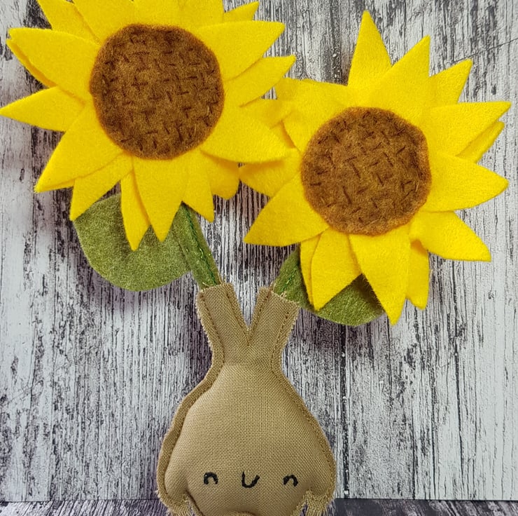 Sprouting from this little mandrake are giant sunflowers, made using felt and hand embroidery on a metal frame.
