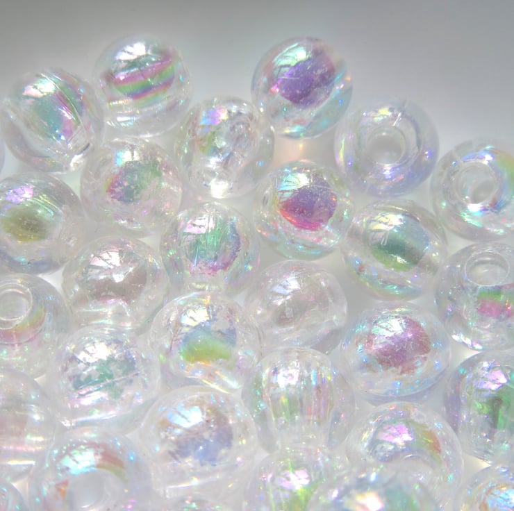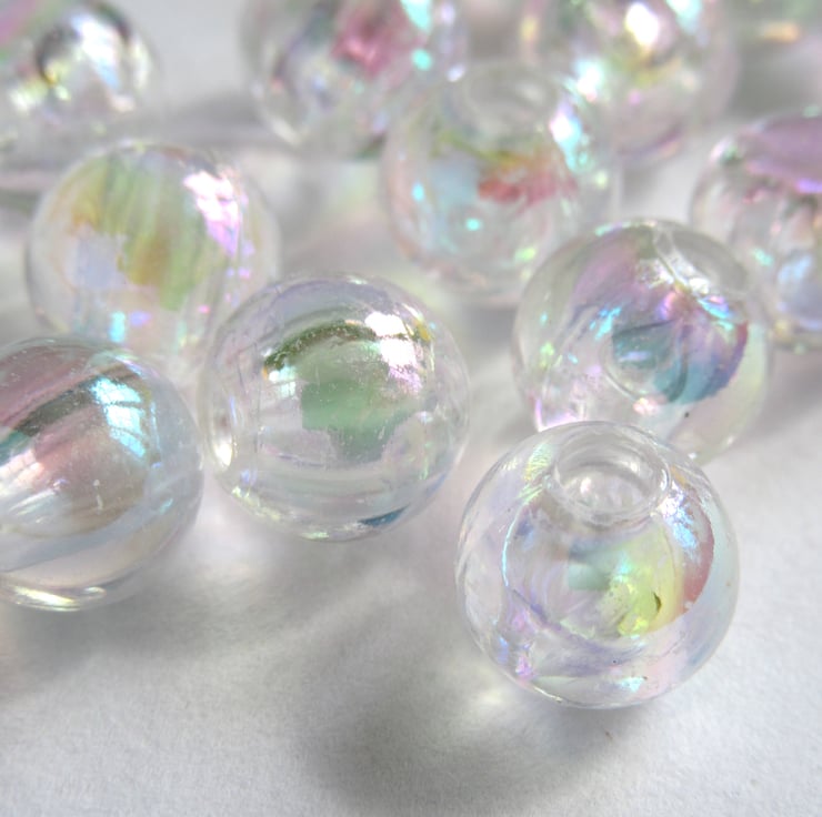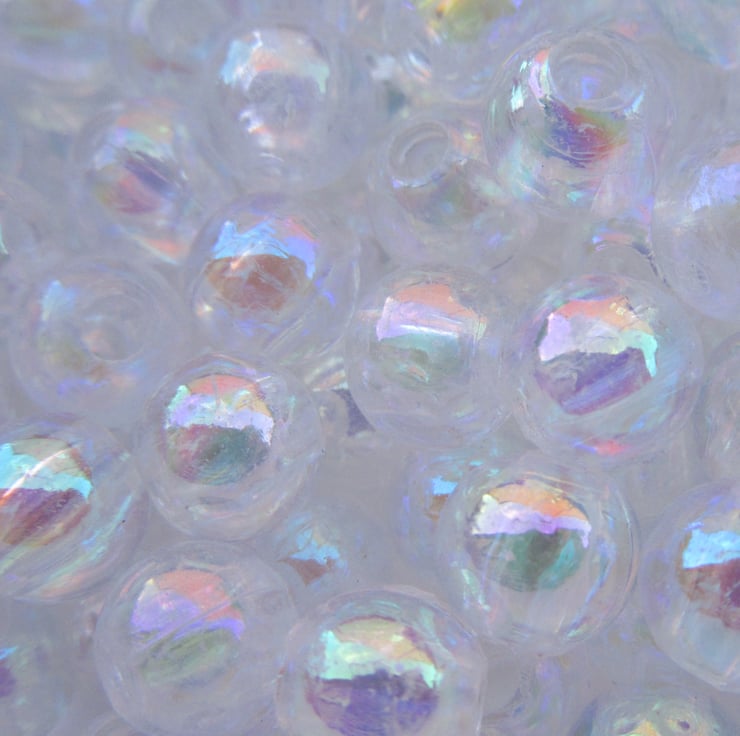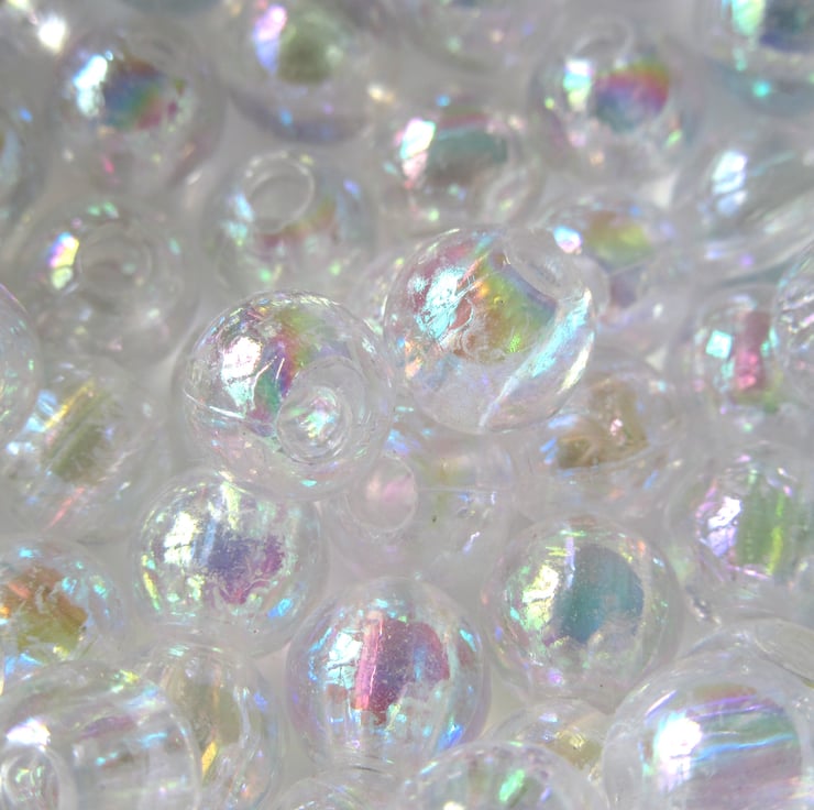 Clear round beads with an iridescent surface.