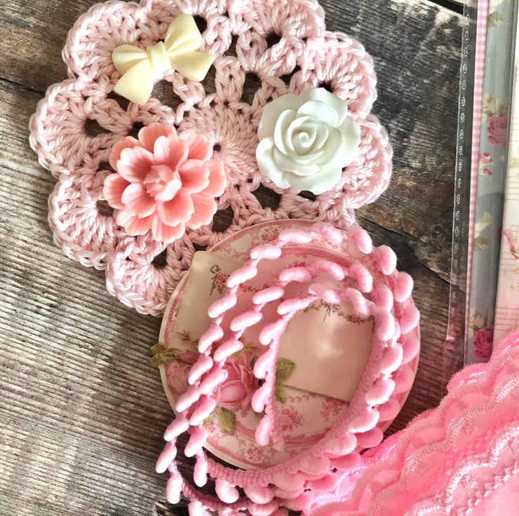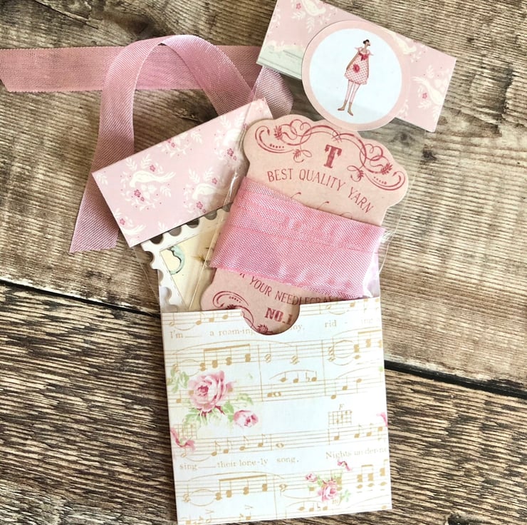 3 x metres of soft pink vintage seam binding on Tilda die cut spool ephemera piece
