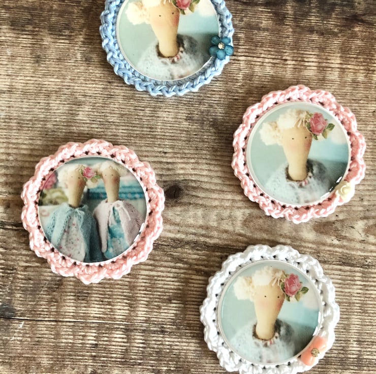 4 x hand crocheted images with clear resin epoxy dome over the top