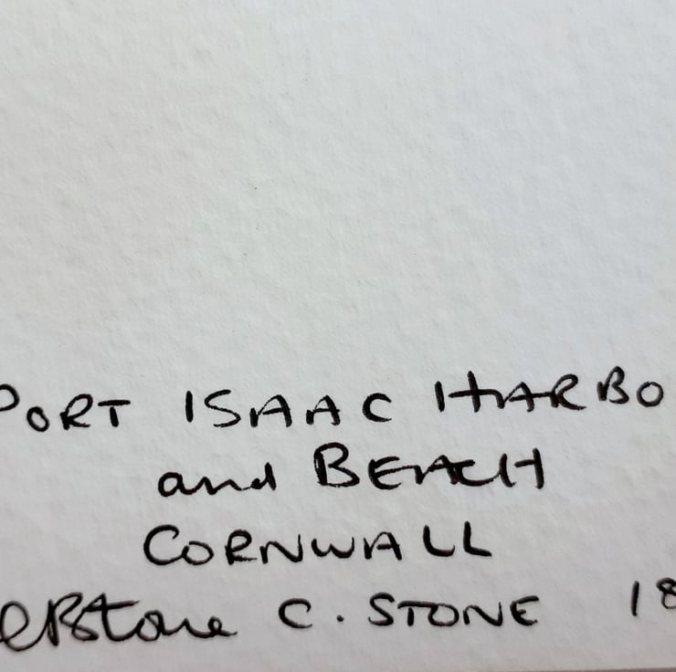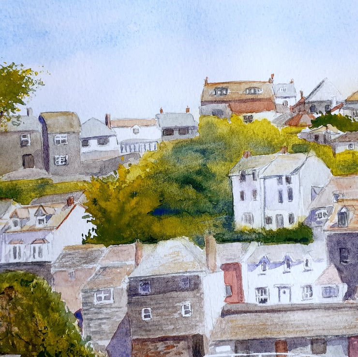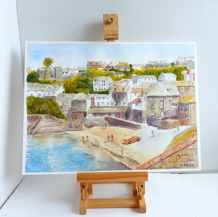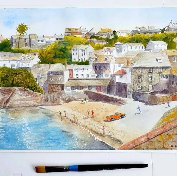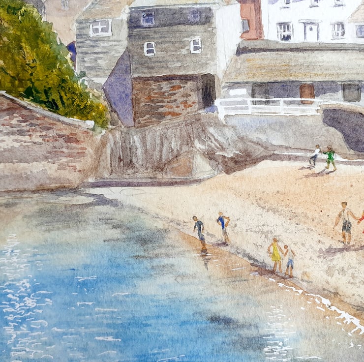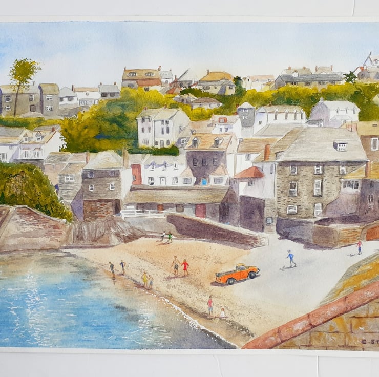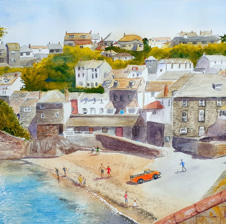 One of my larger paintings, a 16" x 12" watercolour of the harbourside beach at Port Isaac on the north Cornwall coast. Based on my own photographs on a warm summers day.
