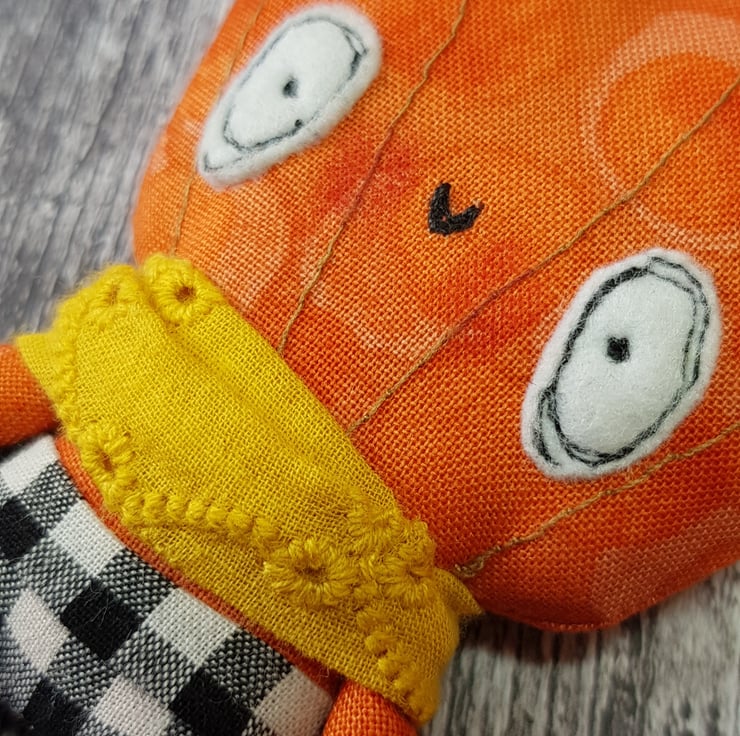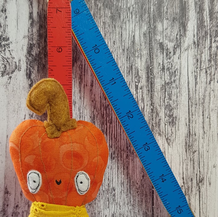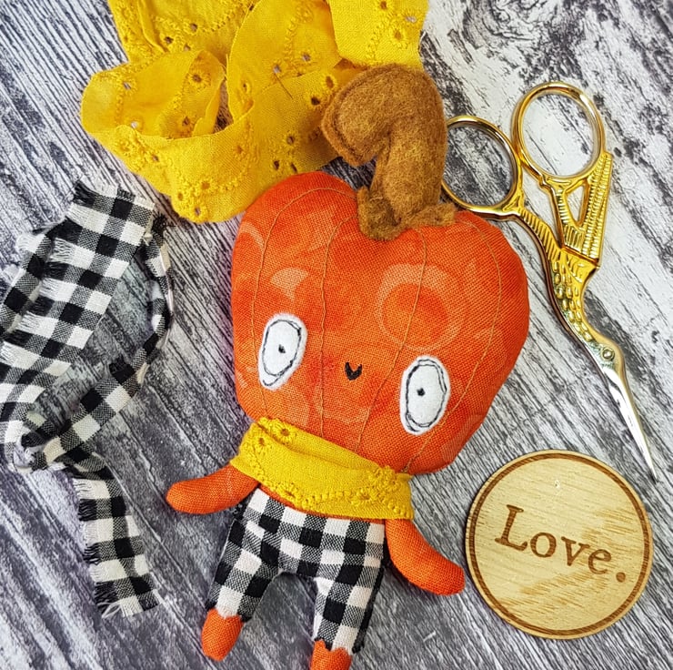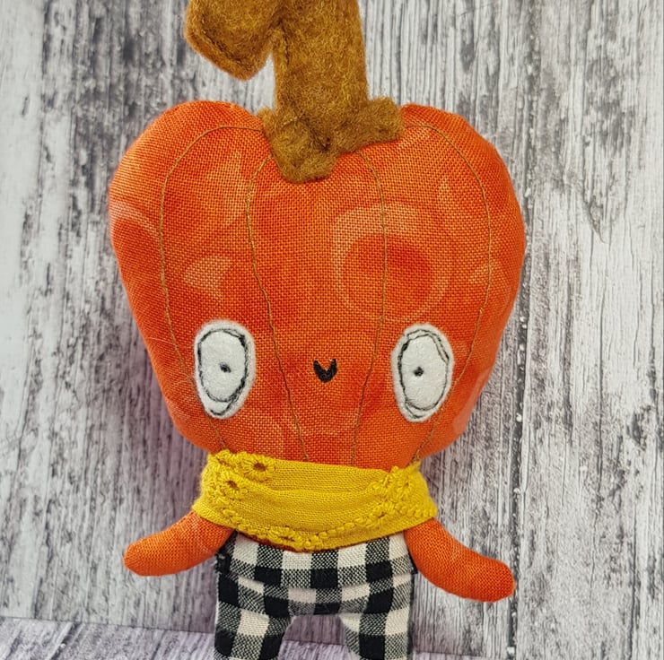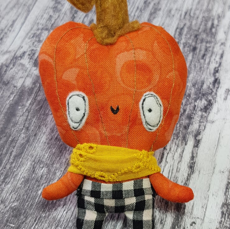 This happy pumpkin is wearing his upcycled best, yellow cotton scarf and chequered shorts with raw edging. His curly stalk is made from eco felt. His body is made from multi tonal cotton and he measures roughly 13cm/5inches tall. This Miniature heirloom will look wonderful either stood against something or hung up. If you'd prefer to hang him up please choose the 'add hanger' option.