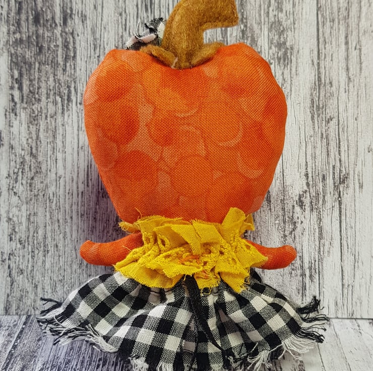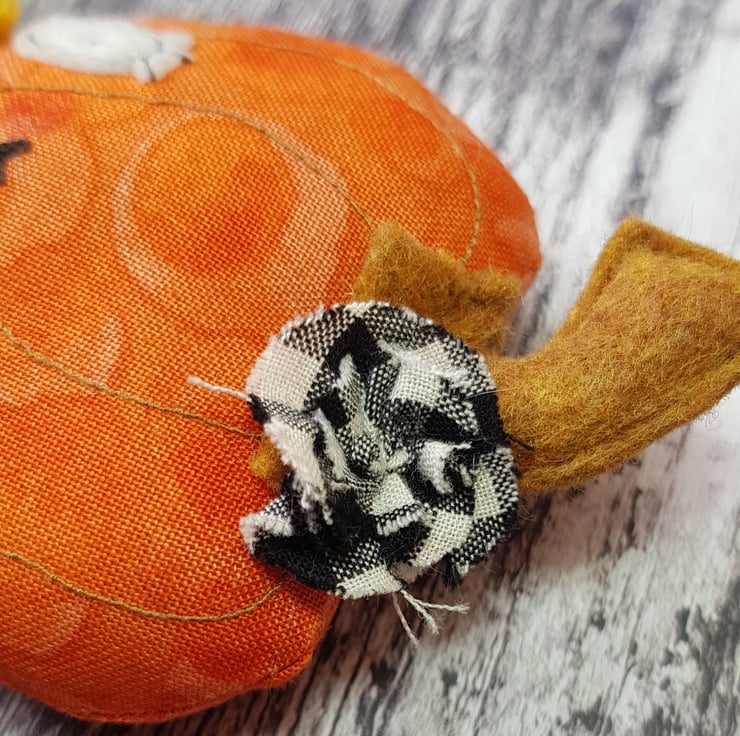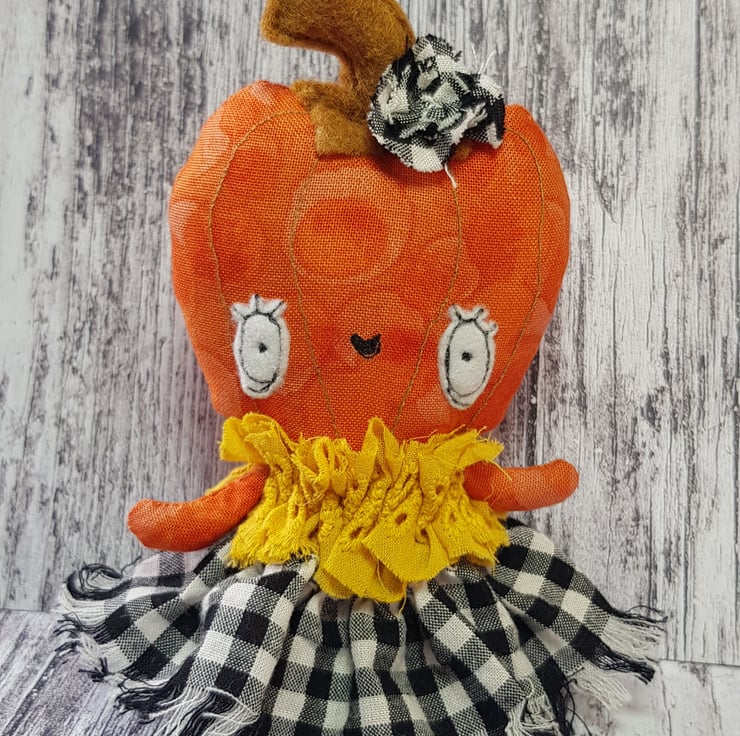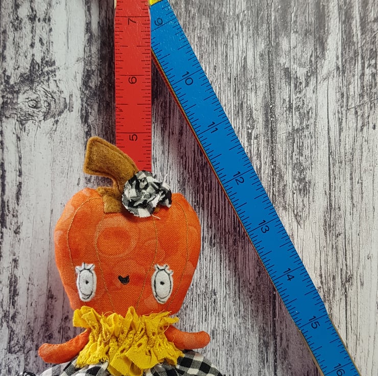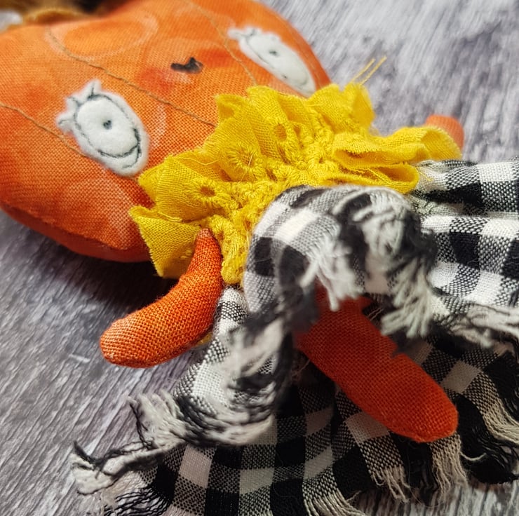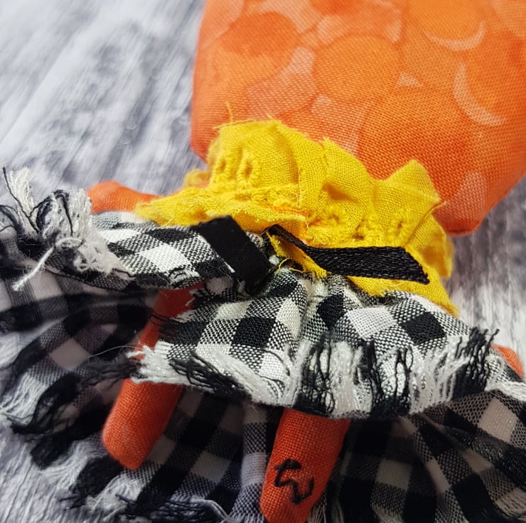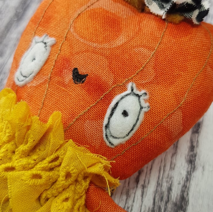 This cheerful girl is in a beautiful upcycled outfit. She wears a full, gathered skirt in black and white chequers and yellow top. The ensemble is full of texture with raw edging and matching headpiece. She has an eco felt stalk and free motion embroidered details. She has a multi tonal cotton body and would look delightful stood against something or hung up. She measures roughly 5 inches/13cm tall.