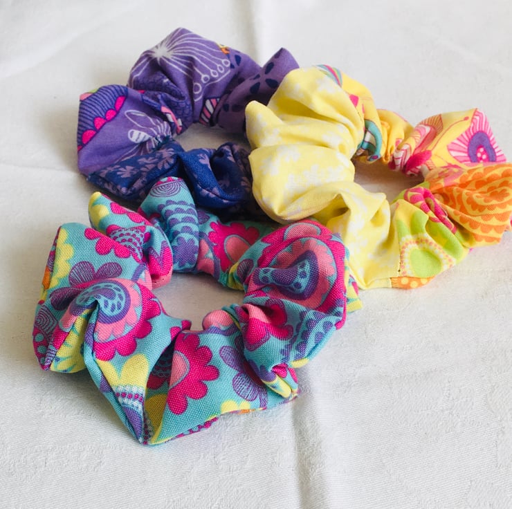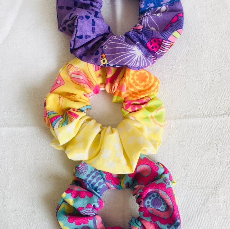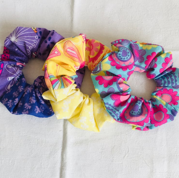 Why not adorn your hair with this set of on-trend beautiful scrunchies, to top off any bun or ponytail, to give hair envy and style your look. This set has been made using stunning quilting weight cotton, in prints and colour's that compliment each other. Great accessories for anyone's hair, to enhance even on a bad hair day.