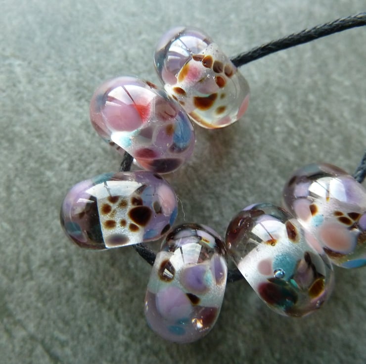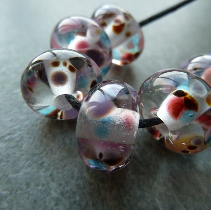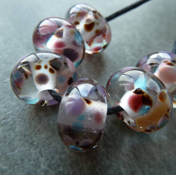 A set of 6 lampwork glass beads made with clear glass and rolled in frit. The frit features purple, blue and brown glass.