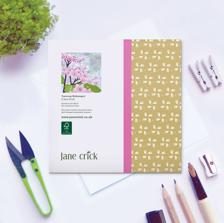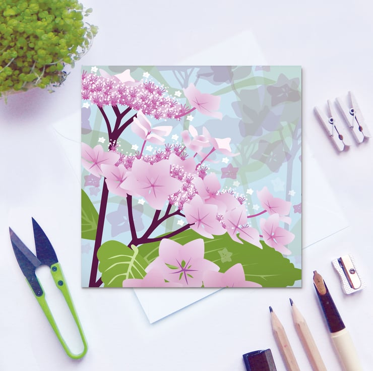 Striking structural flower, pretty floral blank card. Hydrangeas are popular English cottage garden shrubs with huge mopheads of pink flowers - these lacecaps have a more light, delicate flowerhead. Perfect card for gardeners or anyone who loves flowers!