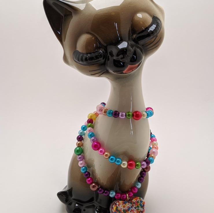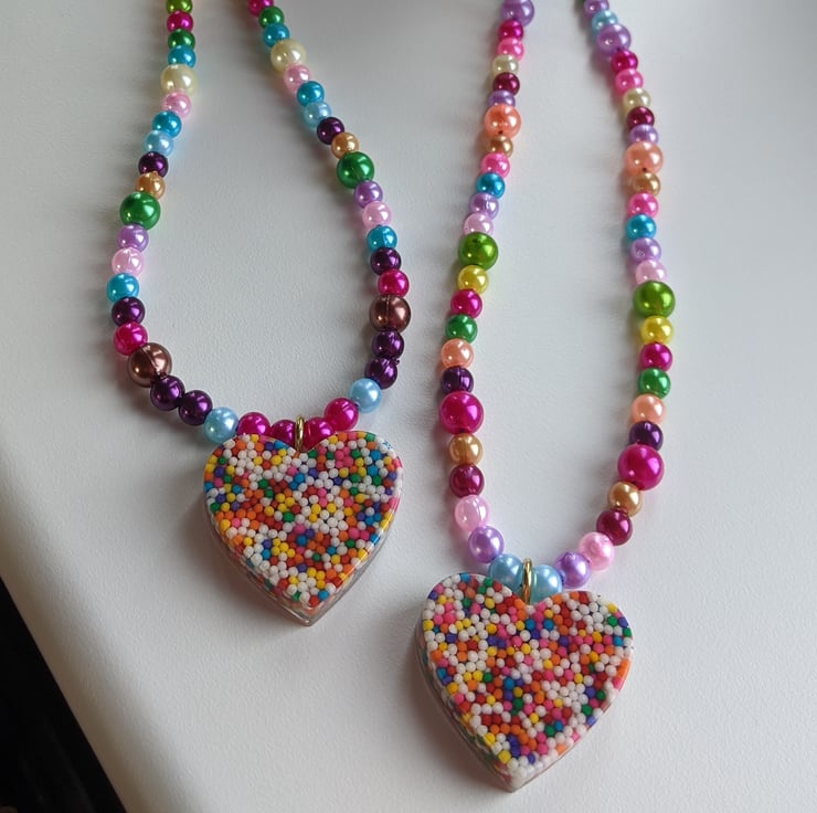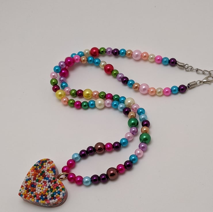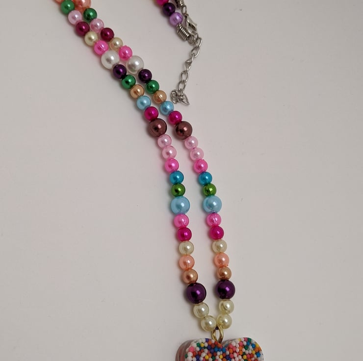 Multi coloured faux pearl acrylic beads are the perfect companion to the handmade resin heart charm, filled with rainbow sprinkles!