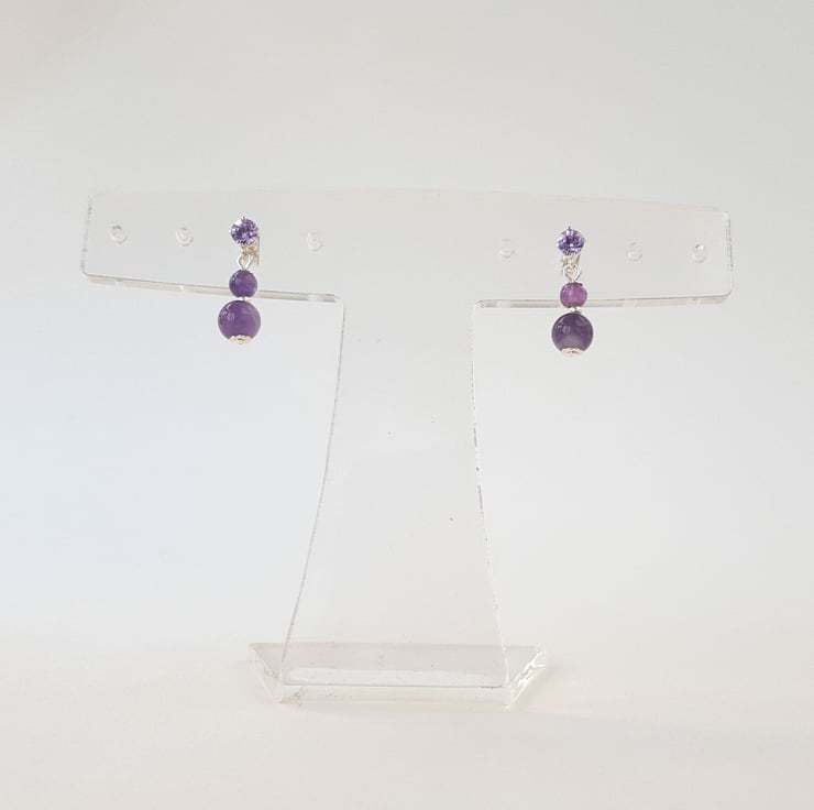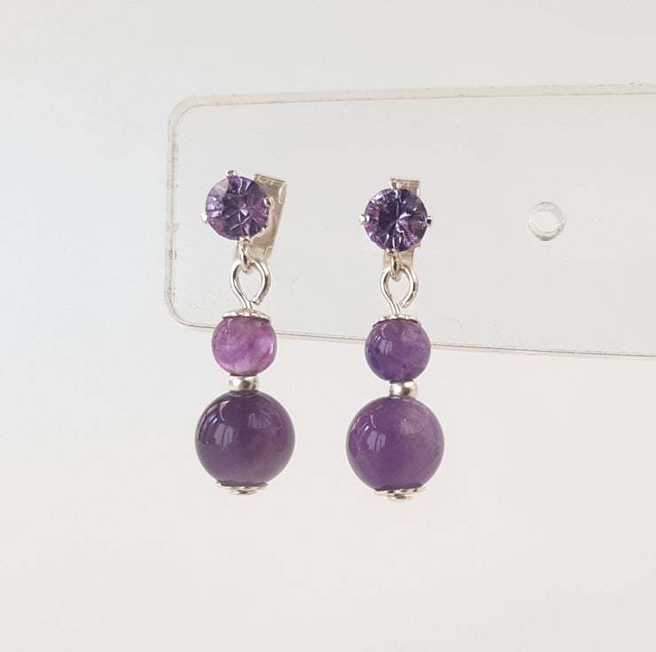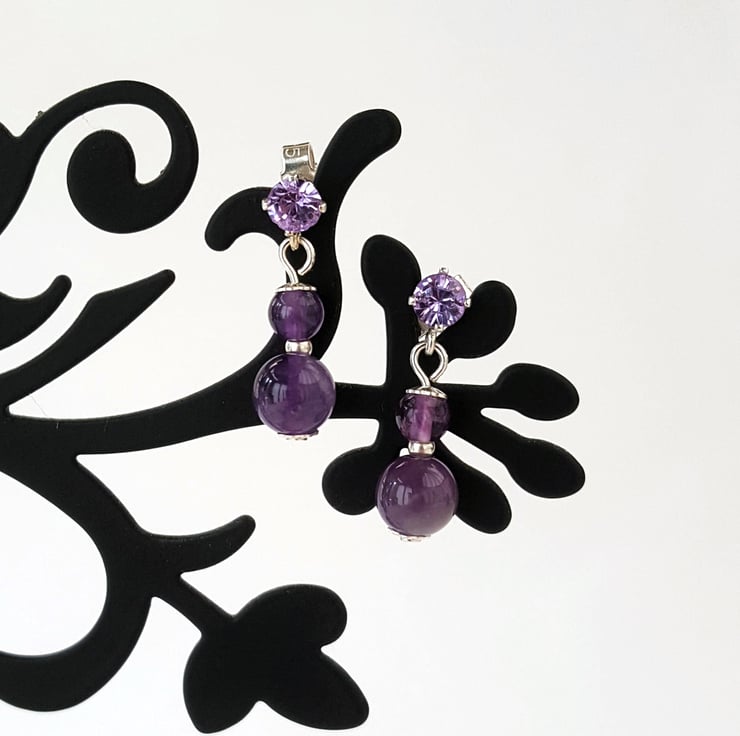 Are you looking for a gift for someone who loves amethysts or the colour purple? These cute earrings are part of a collection of low priced earrings. Each earring has 2 amethyst beads attached to sterling silver ear posts, filled with a purple crystal.