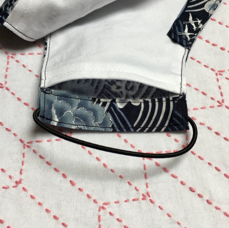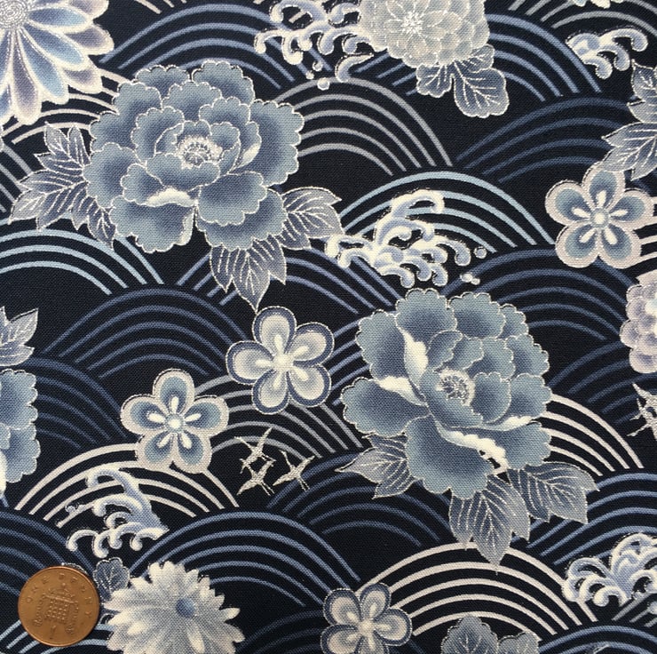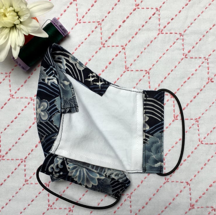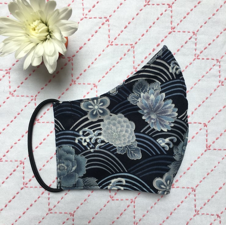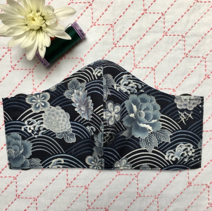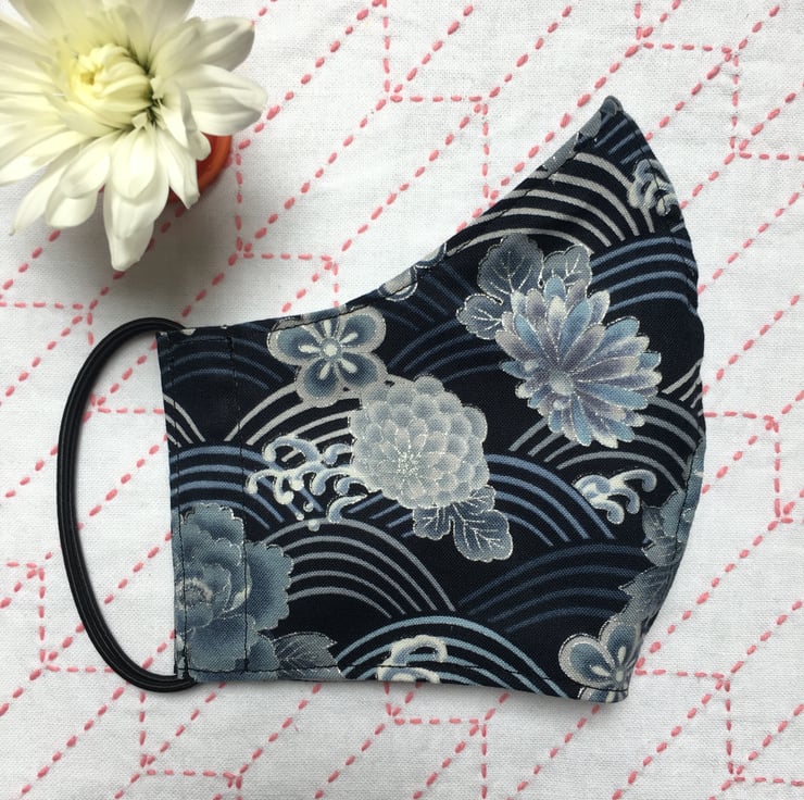 This pretty Japanese fabric with waves and various types of flowers in different shades of blue, and silver gilding has been used to create this medium/ women's mask. The fabric is high quality cotton and the mask is lined with a 600 thread count cotton, which is extremely soft against the skin. The mask is washable and reusable.