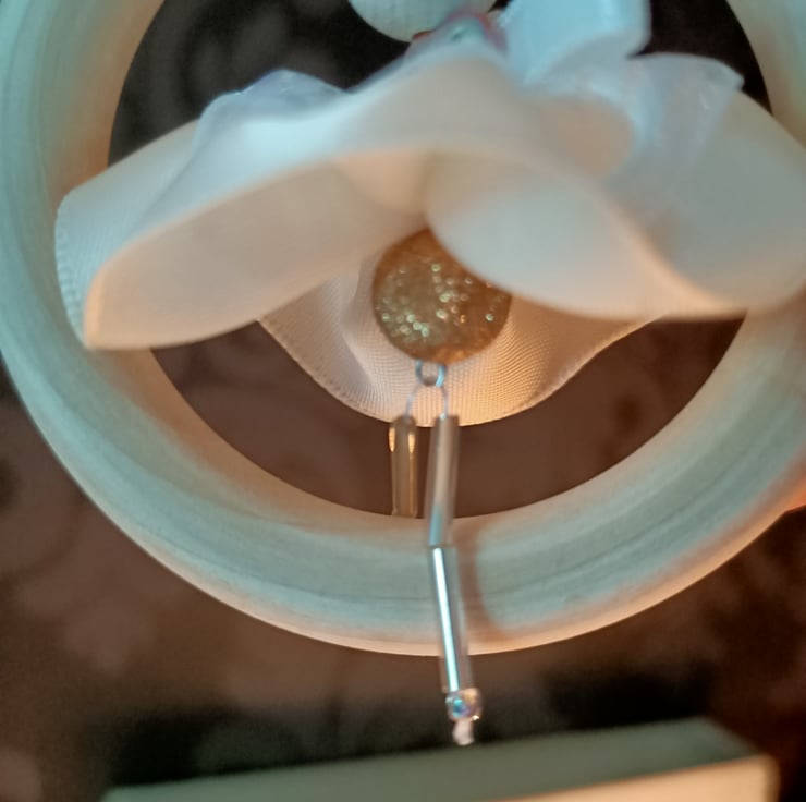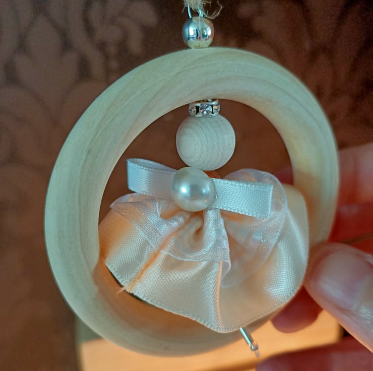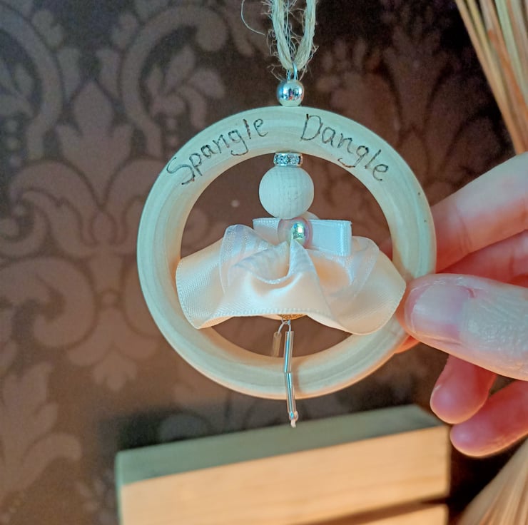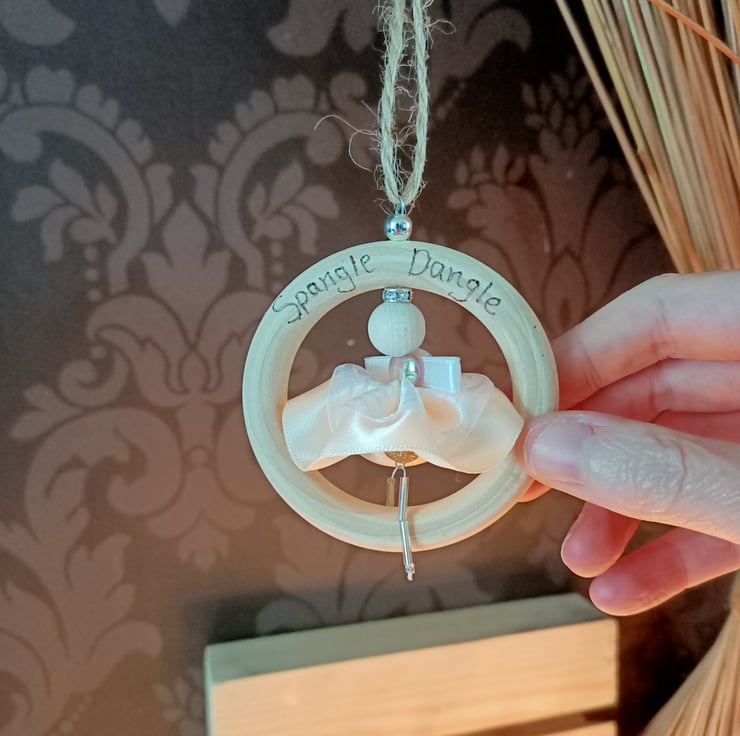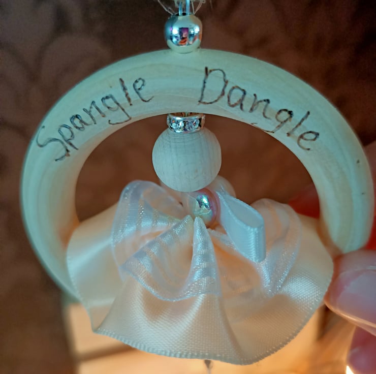 Christmas fairy decoration, Wooden traditional tree decoration, Spangle Dangle is a beautiful fairy with a lovely nature. Her dress has been handmade with ivory satin and white organza. She has a sparkle golden bum and two little dangle legs with crystal slippers. Her body is a rose pink heart and she has ivory fairy wings with a lovely pearl at the back. She really is quite posh! Her wooden beaded head has a beautiful diamante tiara which sparkles in the light. She hangs from a natural hemp string with a silver bead. She is a sensitive sole, her best fairy friend is Whoopsie OOpsie who is dressed similar but has a totally different character.