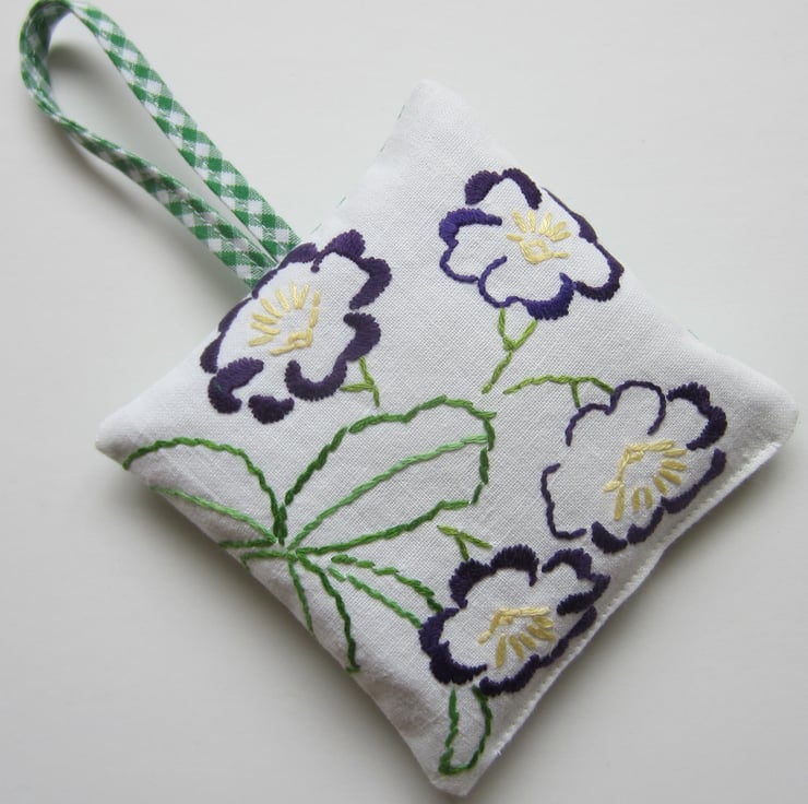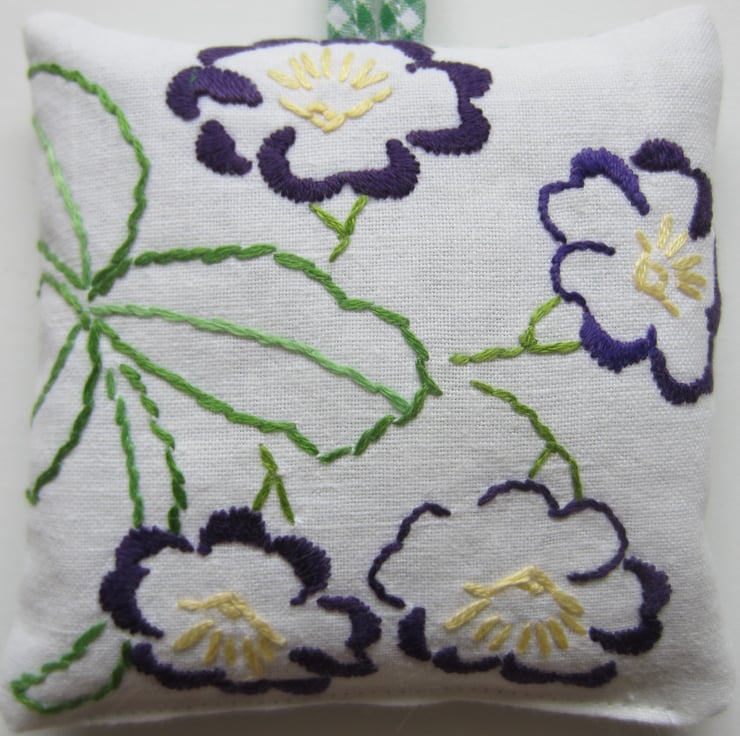 Hanging lavender sachet with a vintage embroidered front in a pretty navy blue flower and green leaf design. The back and loop are in a coordinating green and white gingham check fabric.