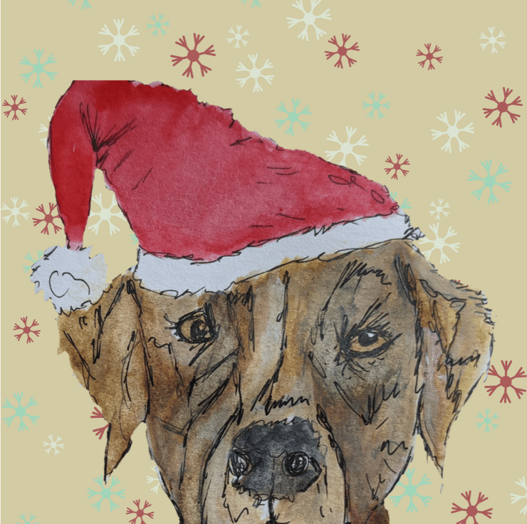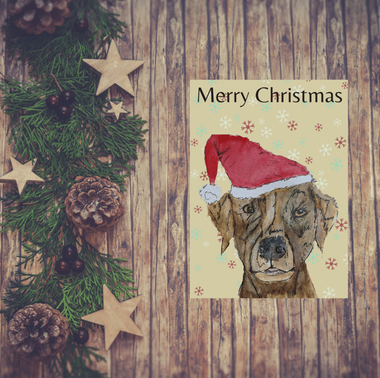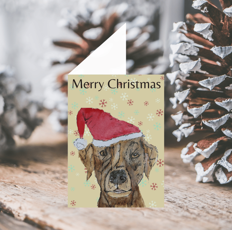 A beautifully printed image of a Chocolate Labrador wearing a santa hat, from my ink and watercolour illustration. This is printed on a premium matt white linen effect 300gsm card, and has a lovely texture, which gives it a quality finish.