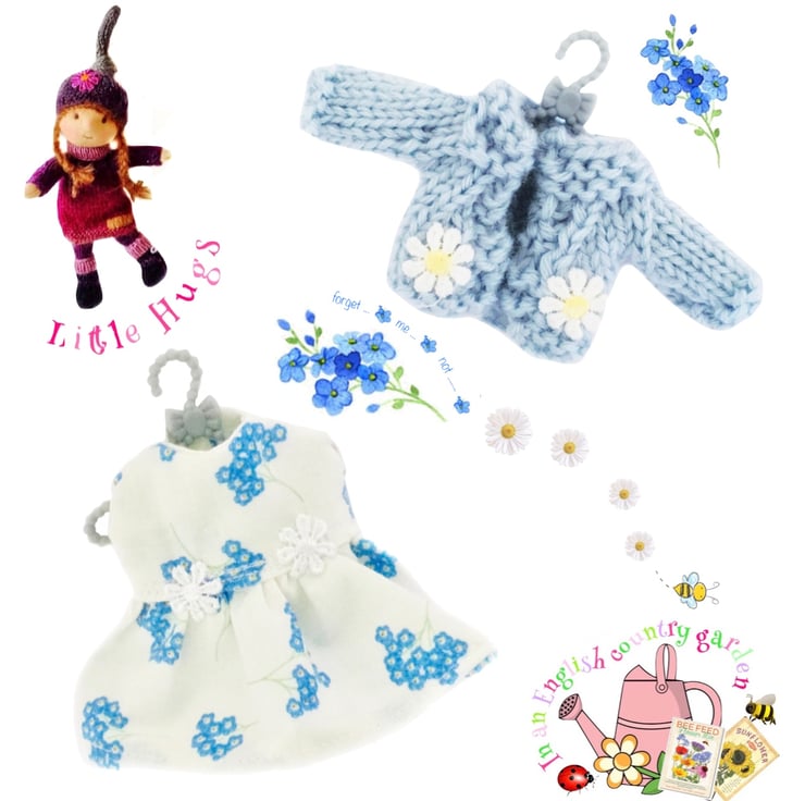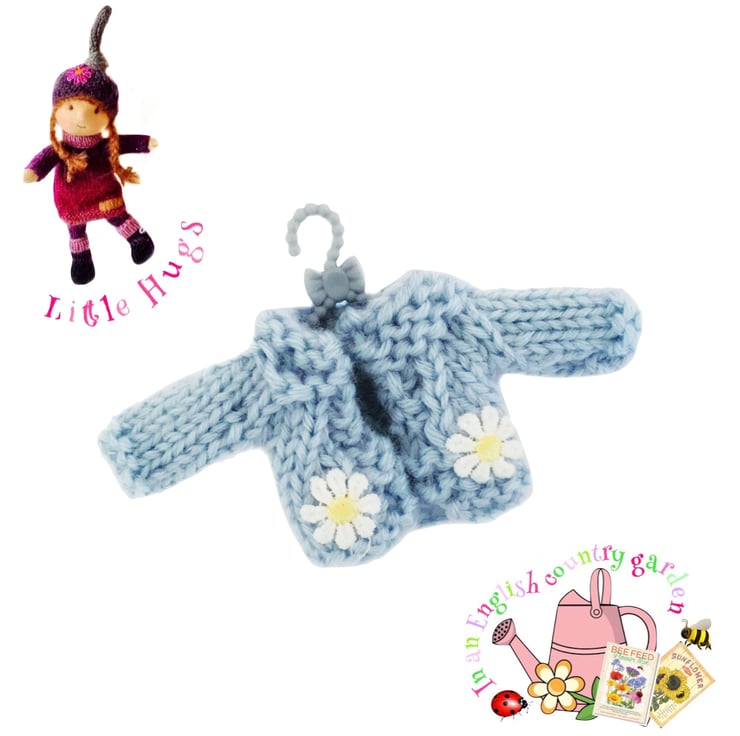 A cute little pale blue cardigan, decorated with tiny daisies, made especially to fit the Little Hugs dolls. The cardigan is hand-knitted and comes on a cute little hanger. It matches the forget-me-not dress.
