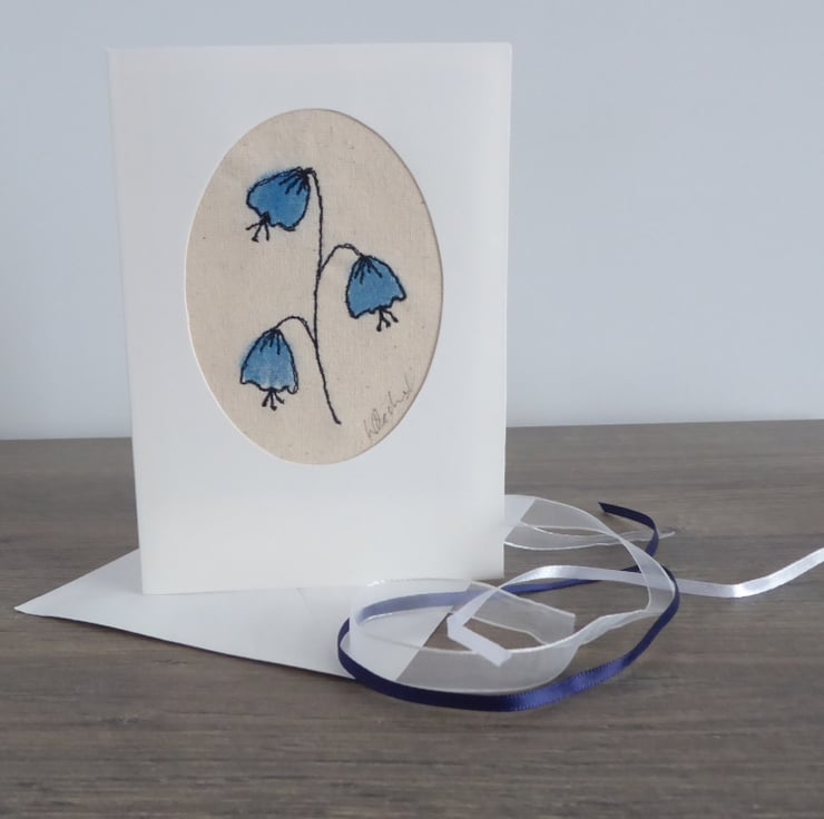 "Bluebells' - On a natural coloured calico fabric and using free motion machine embroidery I have 'drawn' a spray of bluebells and painted the flowers. The embroidery has been signed by the artist and is set into the oval cut out window of the card.