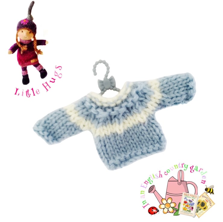 A cute little pale blue jumper, with a cream stripe, made especially to fit the Little Hugs dolls. The jumper is hand-knitted and comes on a cute little hanger.