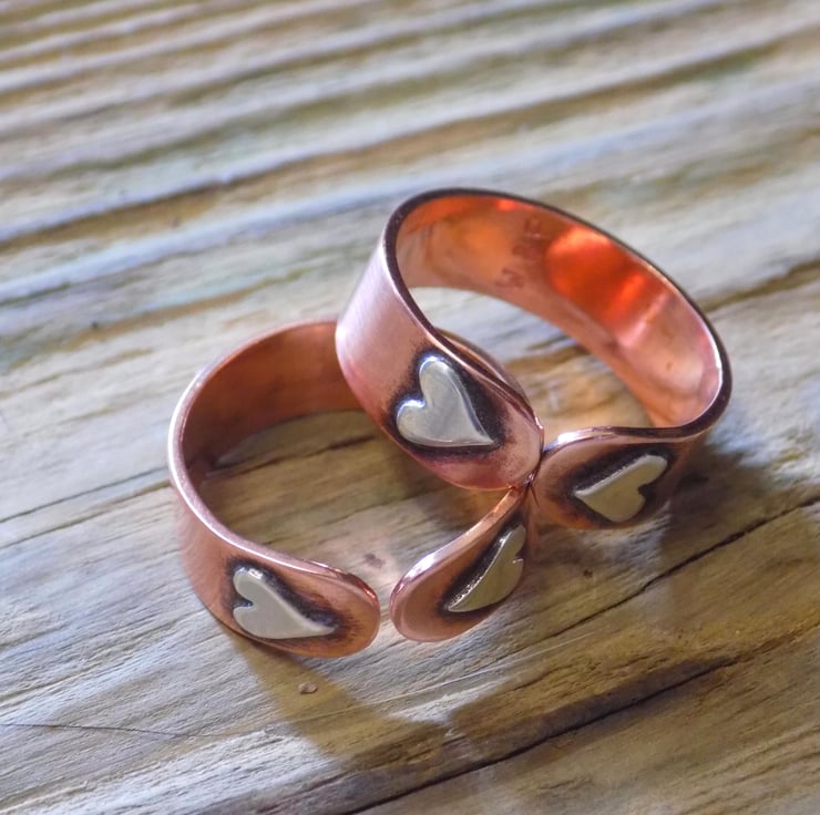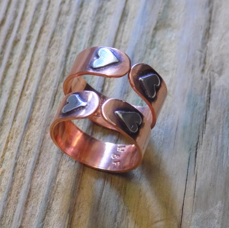 Made from 1 mm copper sheet with sterling silver hearts. The tiny hearts have been hand sawn and carefully soldered on to the copper where the two ends nearly meet, a different take on an adjustable ring. Will adjust slightly a couple of quarter sizes each way. Given a slight aged finish. Size R available for immediate dispatch.