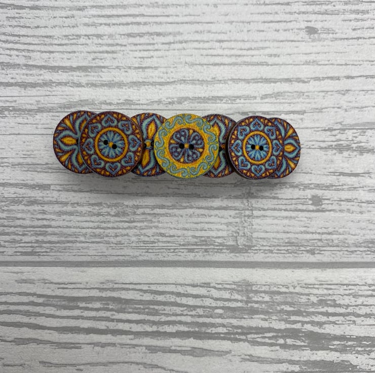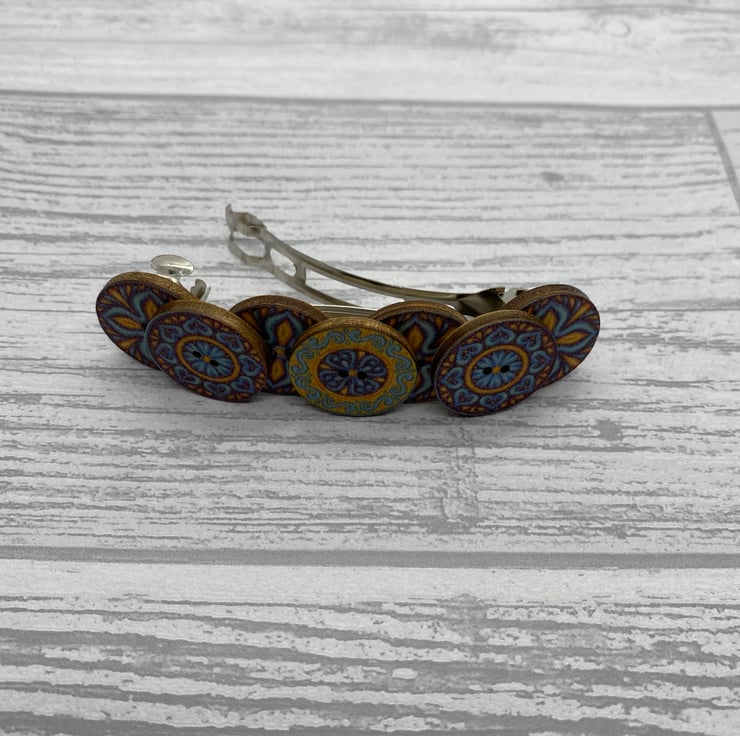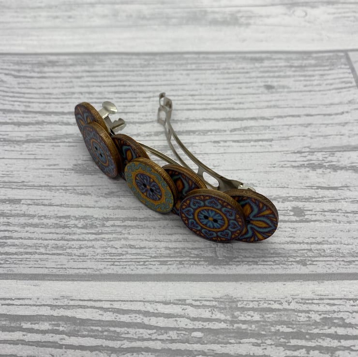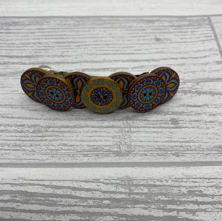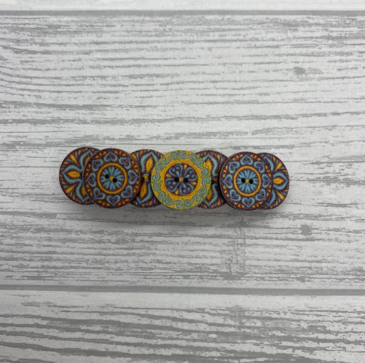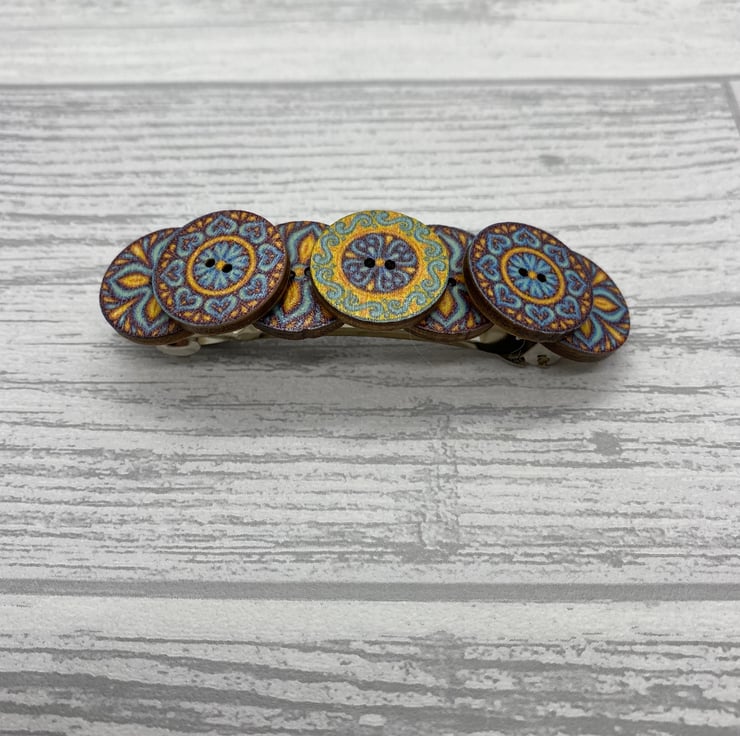 This barrette is made with buttons in three designs. There are four buttons on the bottom row with a cross design. Then there are three smaller buttons on the top row, the outside buttons match with the central button in a different design. All three design use the some colour palette of blue, brown and yellow.
