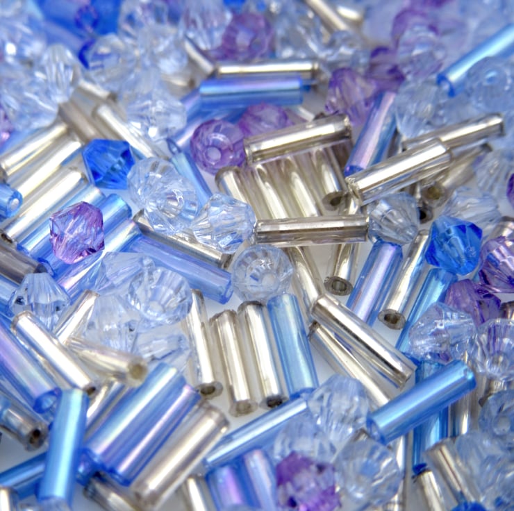 A mixture of purple, blue and silver bugle beads and faceted bicone beads.