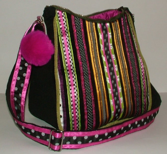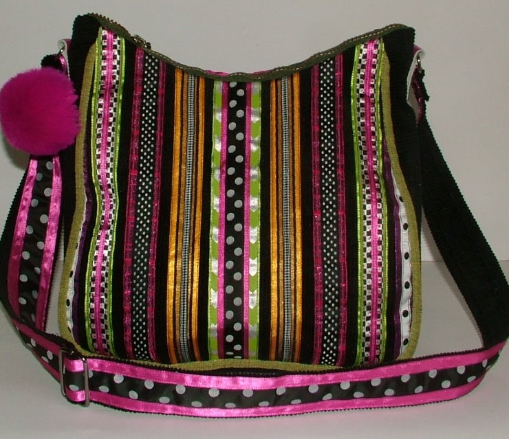 The back is made from Black corduroy which has been overlaid with a varied combination of different plain and pattern ribbons in pink, green, yellow, and black and white.