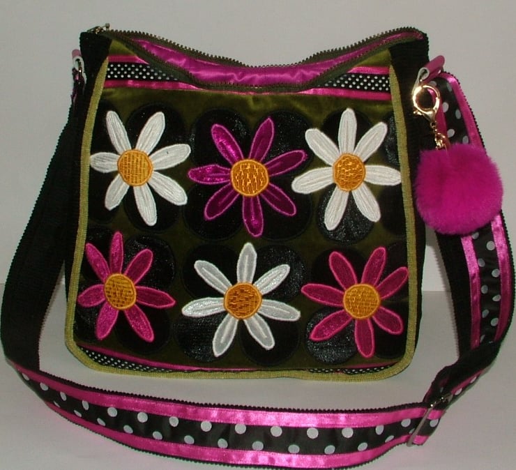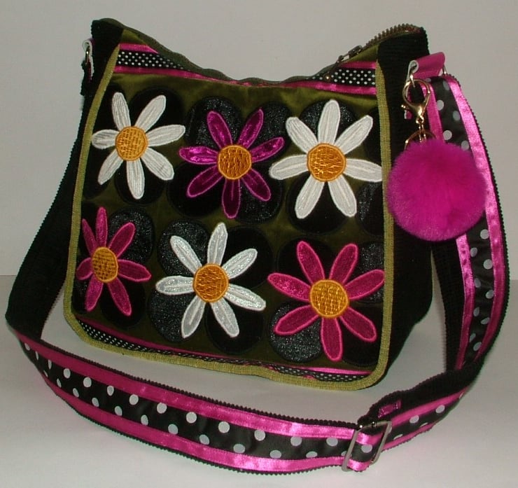 The front is made from a moss green velvet, which has been overlaid with 24 black velvet spots which feature 6 daisy's 3 pink and white which all have vintage yellow centers, running along the top and bottom is a strip of pink and black and white spotty ribbon.