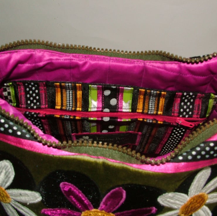 The handbag fastens with a chunky green zip which when open reveals inside a quilted pink lining with a funky inside pocket (which matches the back) with makers label.