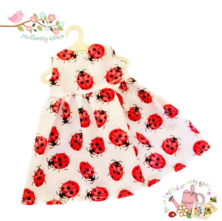 A pretty little white covered in little red ladybirds to fit the Mulberry Green characters. The dress has a full skirt and a lined bodice and is part of the English Country Garden collection. It is made from polycotton and comes on a cute little wooden hanger. It matches the white ladybird cardigan.