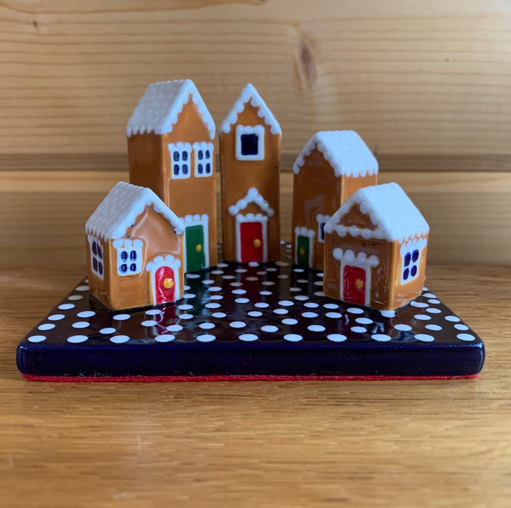 These five earthenware ceramic houses have each been individually hand painted using in a classic gingerbread underglaze paint with traditionally festive red and green accents. A scattering of white raised dots creates a snowy rooftop effect.