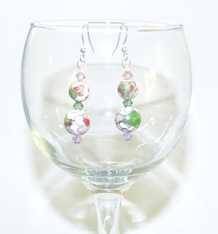 These drops hang from comfortable, metal hook wires the drop is approx 4cm long and are made up from varying size of cloisonne beads with a white base and pink flowers on with green foliage. Each flower has a metallic gold outline. Between the oriental looking beads are bicone Swarovski crystal element beads in a complimentary green colour and pink coated bicone bead. These earring are very summery, ideal to compliment any bright outfit.