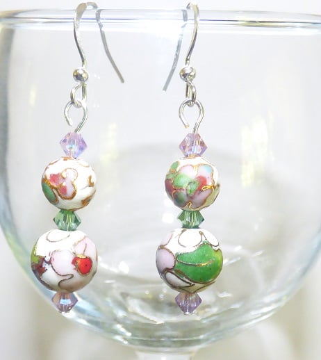I love to mix Swarovski ab crystal element beads with other pretty beads I have. These pink ab coated beads and white cloisonne beads with pink flowers work perfectly together to make this one of a kind pair of earrings.