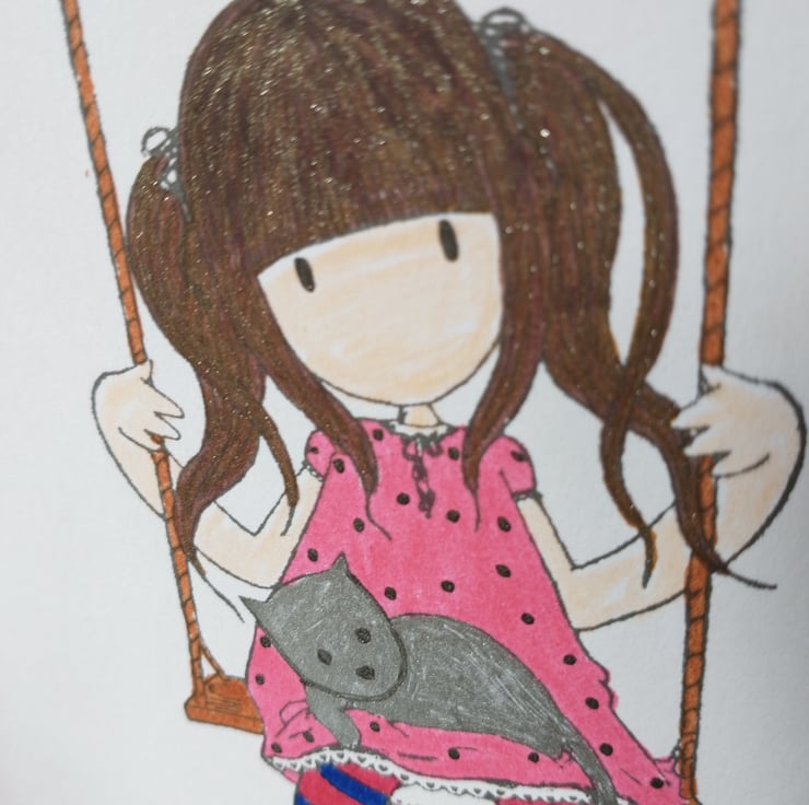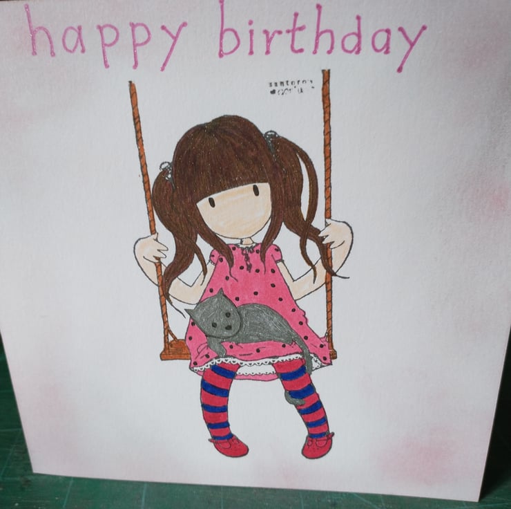 A completely handmade and uniquely designed card. Consisting of a stamped image of a little girl on a swing with her pet cat. Hand coloured. On quality pristine white card which has been shaded in pink ink. Happy birthday hand written in pink ink.