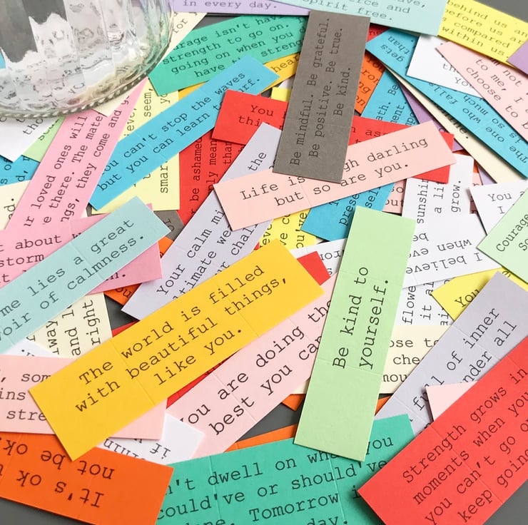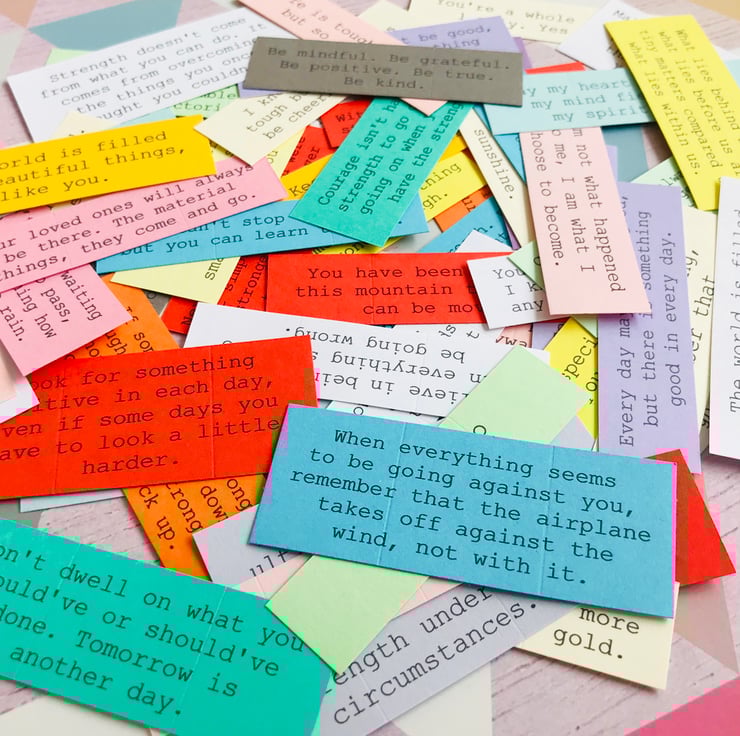 365 quotes printed on high quality coloured card pieces. I've hand picked each individual quote and they are a mix of motivation, strength, calm, courage, happiness, affirmations, friendship and family quotes.