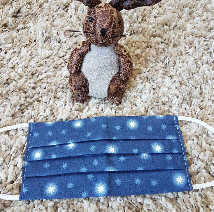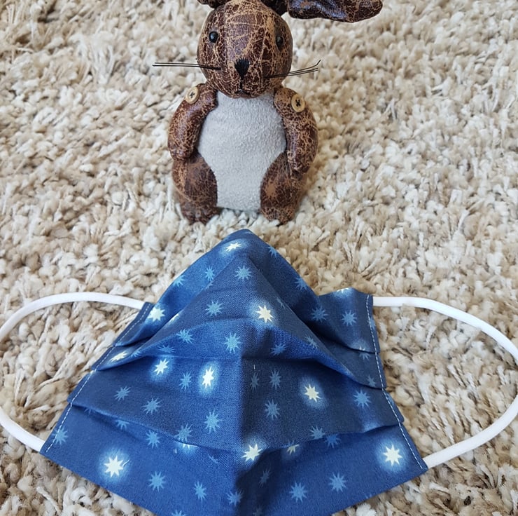 Adult face covering made from a twinkly star print on navy cotton. The face mask is made with 2 layers of cotton forming an inner pocket for a filter (not included) and is fastened over the ears with 2 loops of elastic and a toggle adjuster.