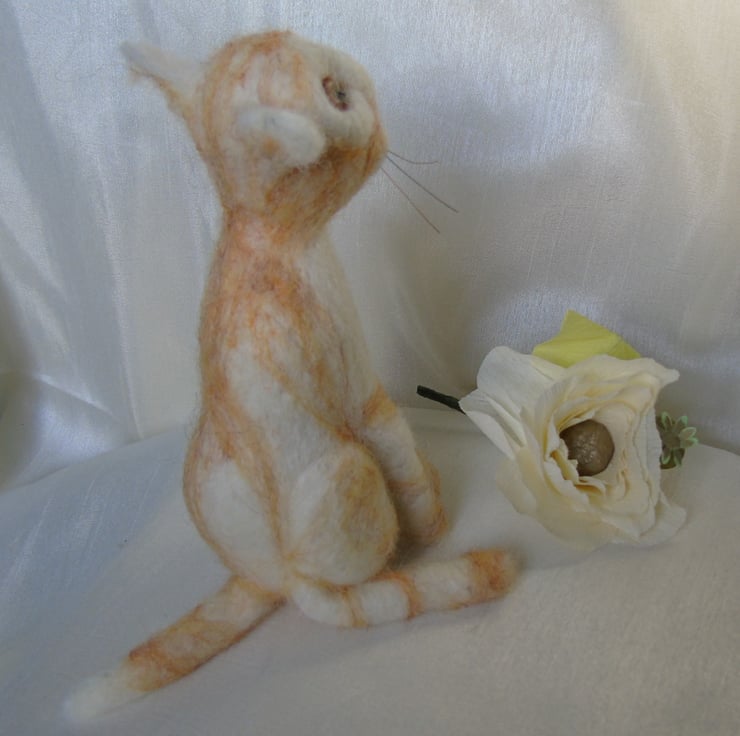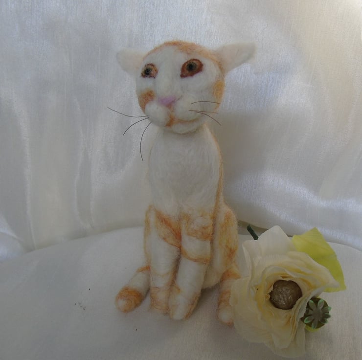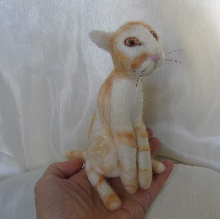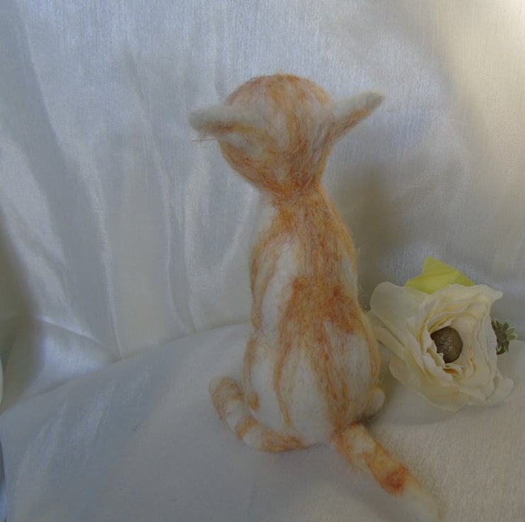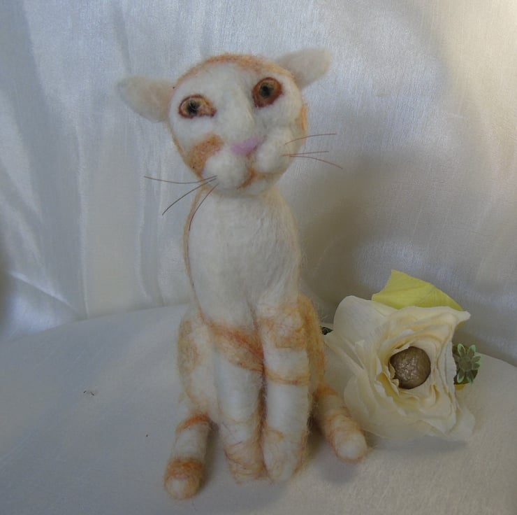 An adorable cat needle felted from wool using a sharp barbed need. It took many hours to make.