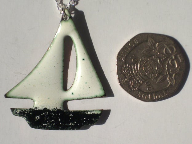 The boat measures 38mm tall by 31mm wide. It is mounted on a 45cm silver plate, curb chain that fastens with a simple bolt ring.
