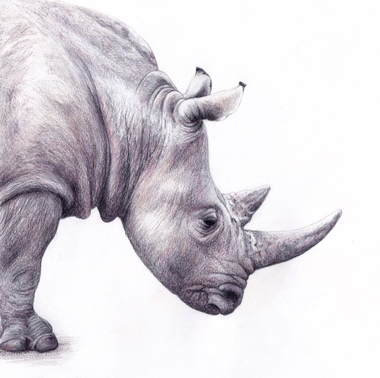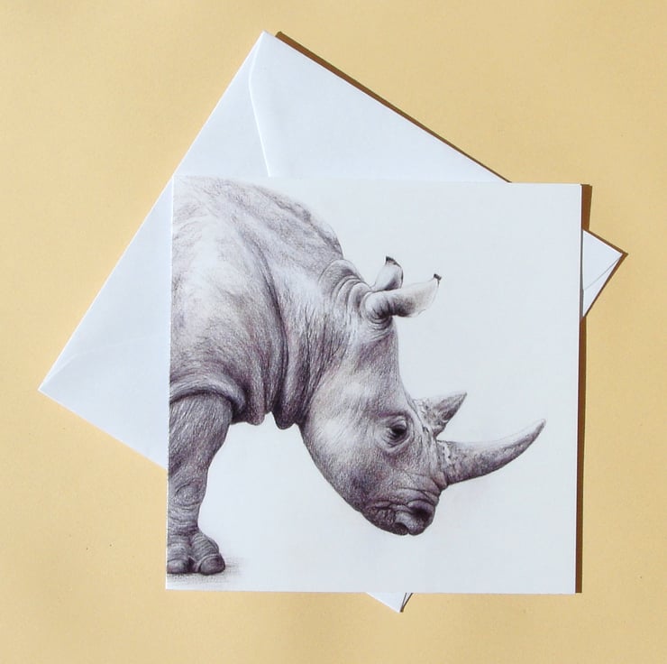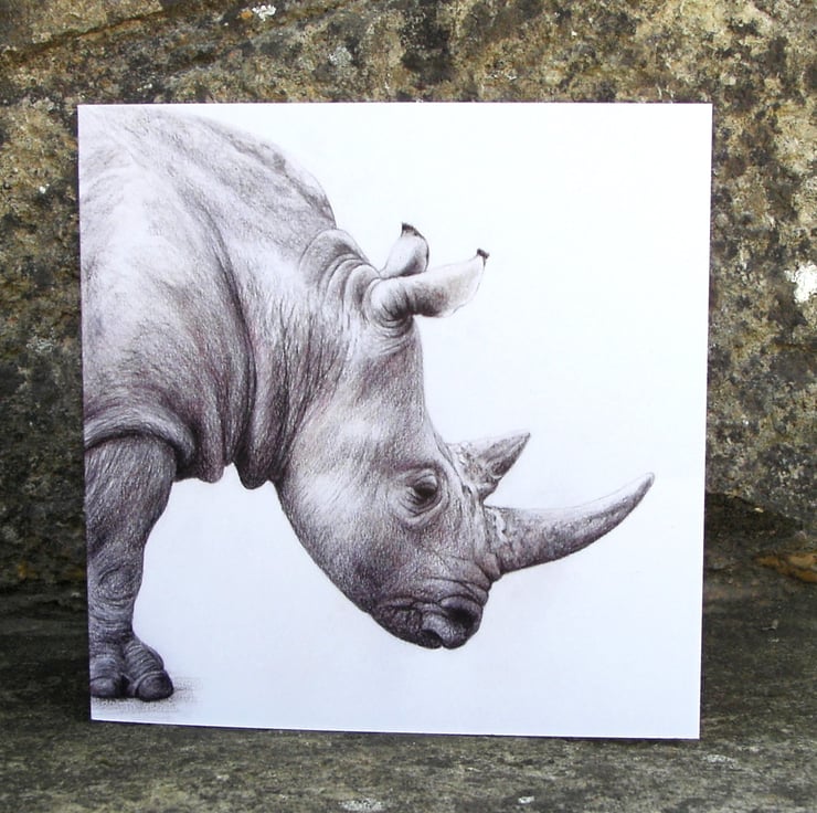 ‘Rhino’ - This card is a reproduction of one of my original coloured pencil drawings. When I looked closely, I could see many shades of pinks, purples and browns in his ‘grey’ skin. What a striking silhouette his square head and huge horns make!