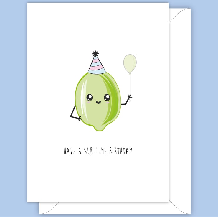 An A6 (folded) birthday card made with 350gsm FSC card depicting a hand drawn lime wearing a party hat, holding a balloon and has a happy cartoon style face. The card is silk coated on the outside to make the image pop and matt on the inside so you can easily write your own message.