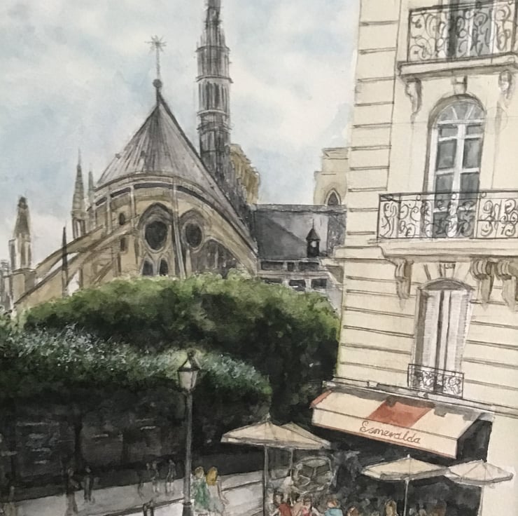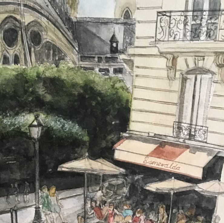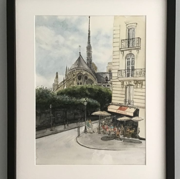 Beautiful original watercolour painting of cafe life on a sunny day with Notre Dame in the background. 297mm x 410mm (A3), without mount, in size. Sold with mount but not frame.