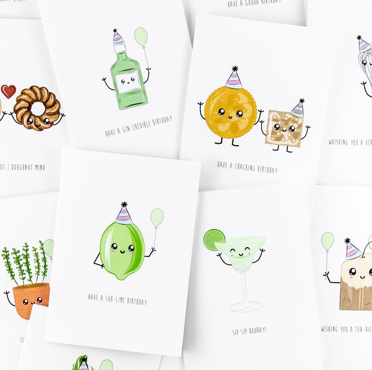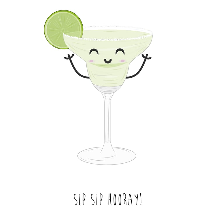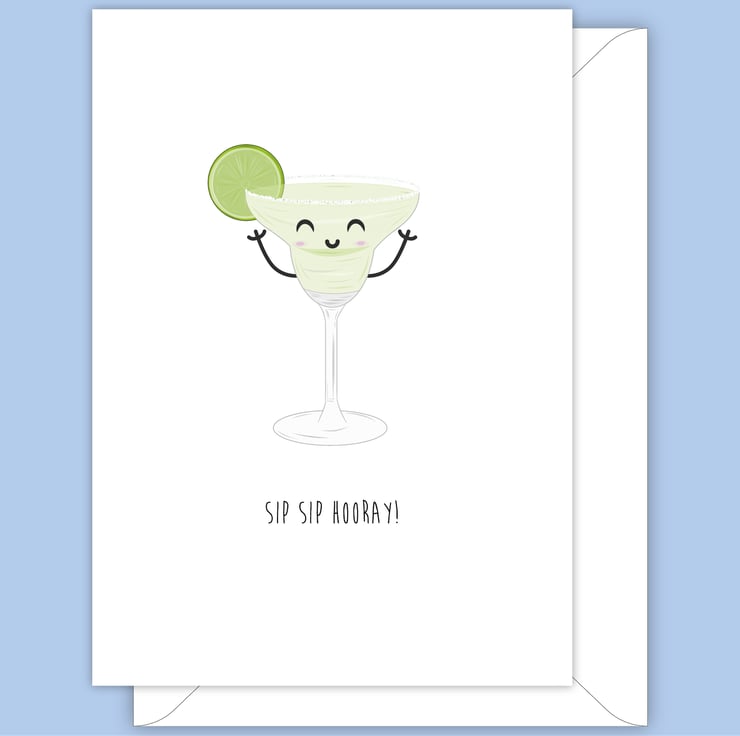 An A6 (folded) birthday or party/celebration card made with 350gsm FSC card depicting a hand drawn cocktail glass with a slice of lime and has a happy cartoon style face. The card is silk coated on the outside to make the image pop and matt on the inside so you can easily write your own message.