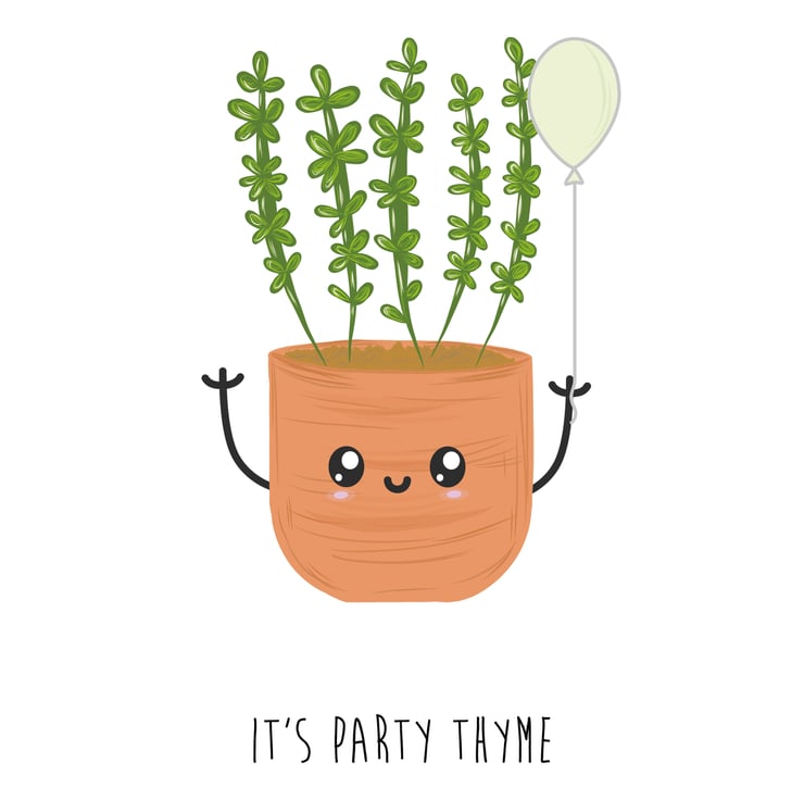An A6 (folded) birthday or party/celebration card made with 350gsm FSC card depicting a hand drawn pot of thyme, holding a balloon and has a happy cartoon style face. The card is silk coated on the outside to make the image pop and matt on the inside so you can easily write your own message.