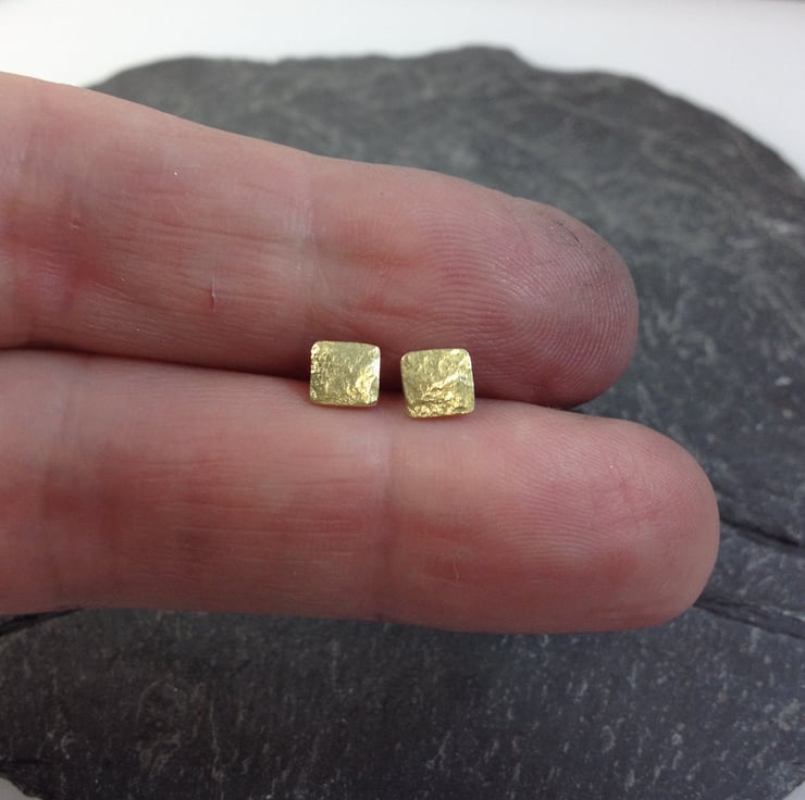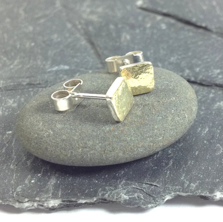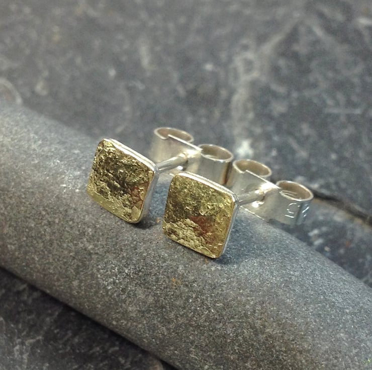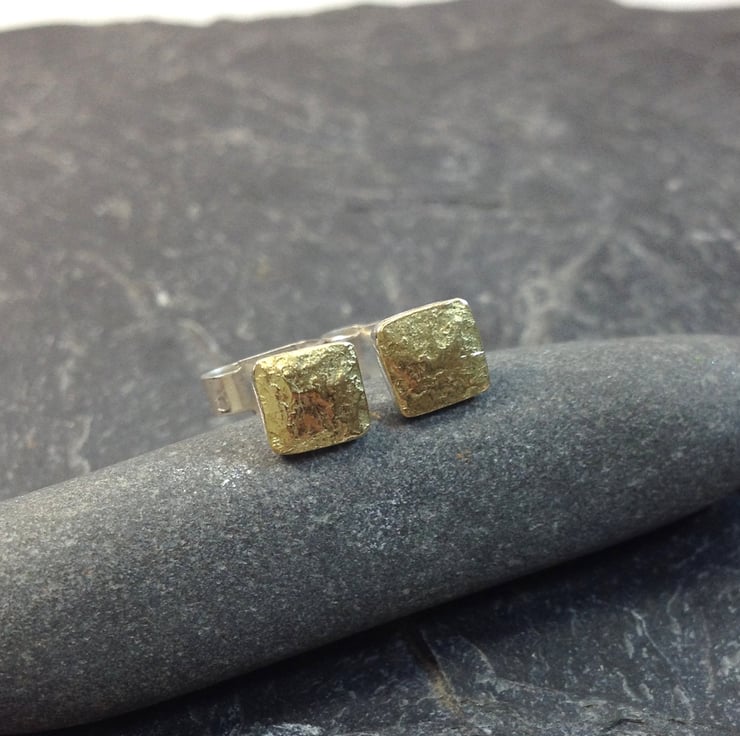 I have soldered a thin sheet of 18 ct gold to a thick sheet of silver , then cut out and textured these little square studs, the posts and butterflies are sterling silver too. They have been burnished to a subtle shine - ( you could have a matte finish if preferred) .
