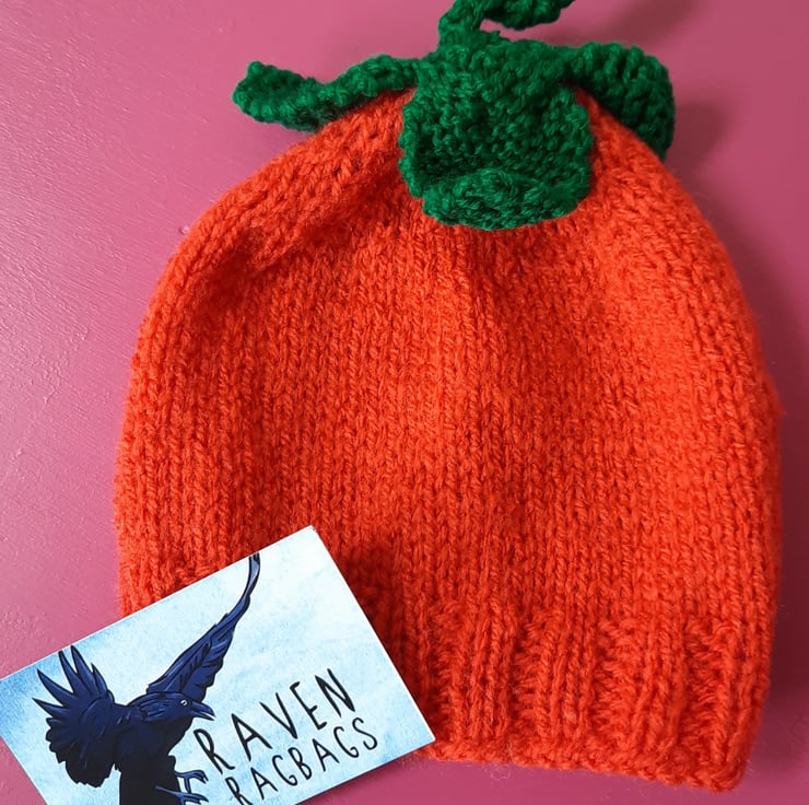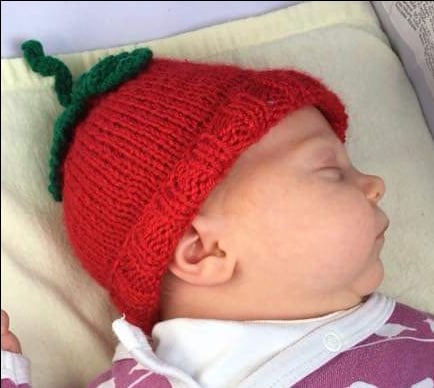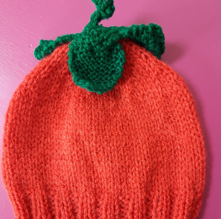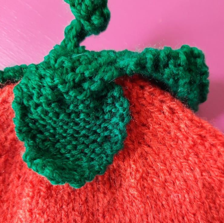 Such a cute gift idea for a new baby, hand-knitted orange Berry baby hat with green knitted leaves and stalk made in soft, easy care acrylic yarn. Just adorable!