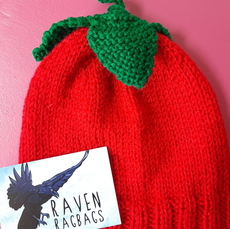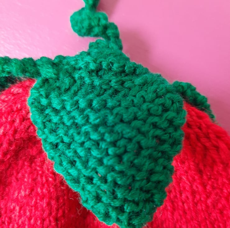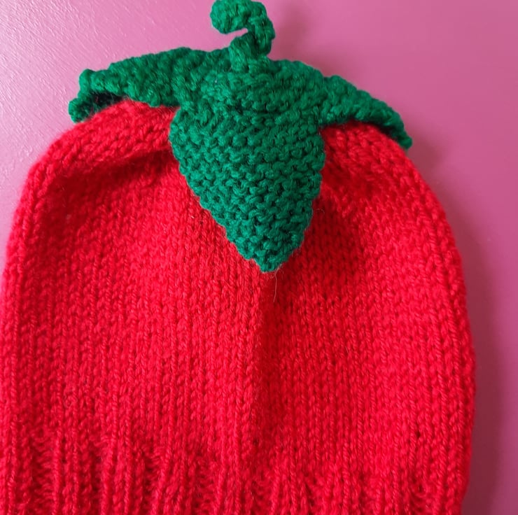 A perfect gift for a newborn baby in the family. How adorable will they look in this cute little hand knitted berry hat made in soft feel, easy care acrylic yarn with a dark green stalk and leaves on top?