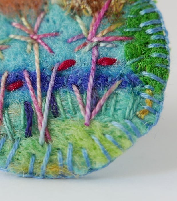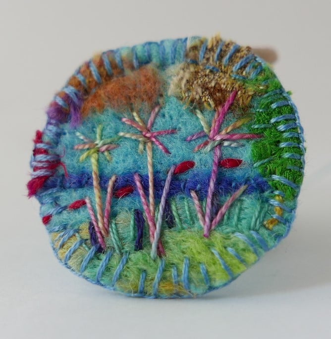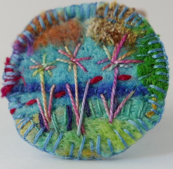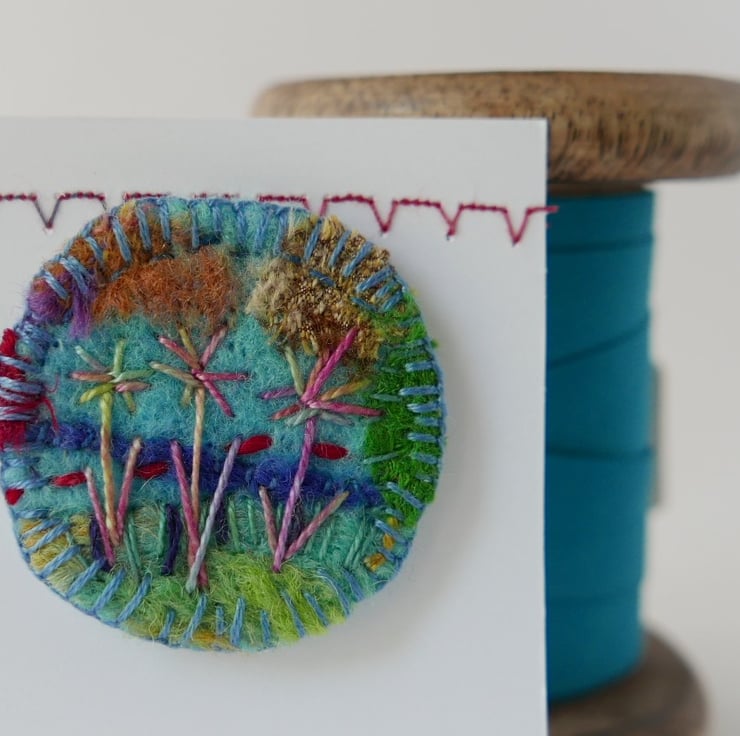 A handmade turquoise merino felt brooch with three feature wild flowers. There is additional red running stitch in the background, along with a longer stitch representing grass. A beautiful meadow scene.