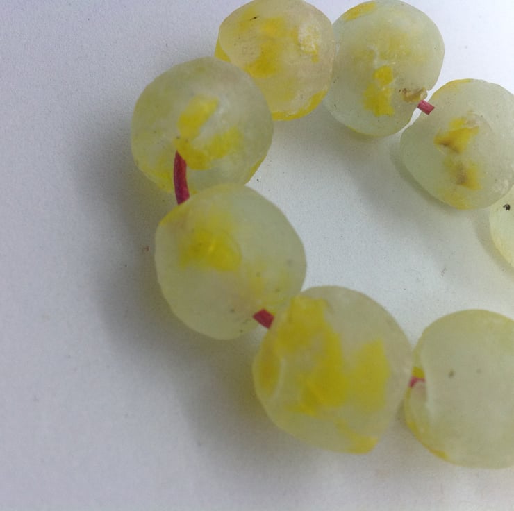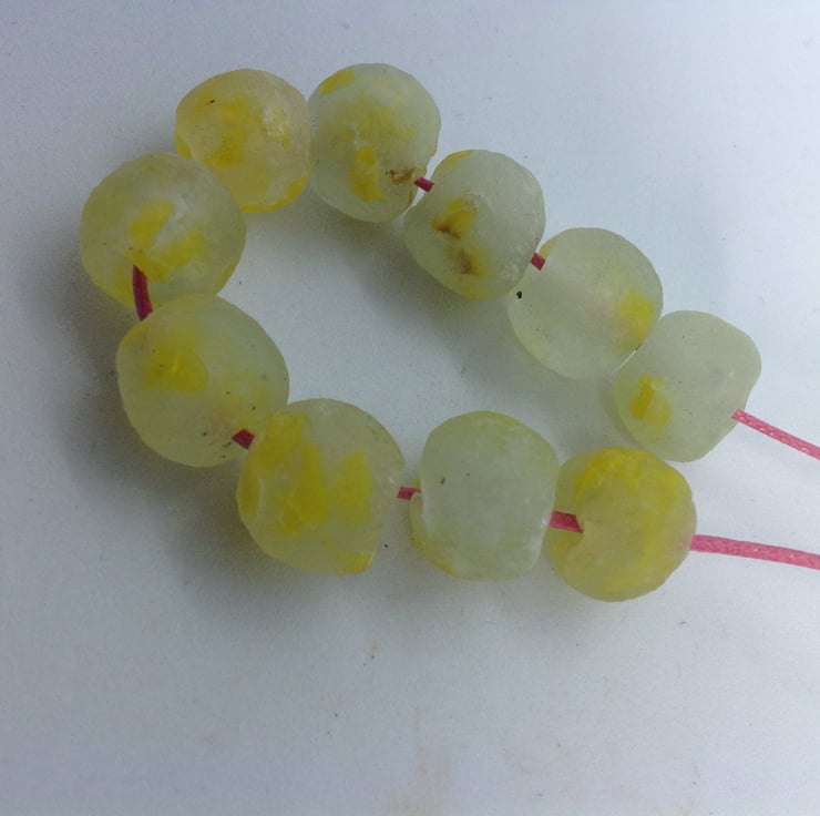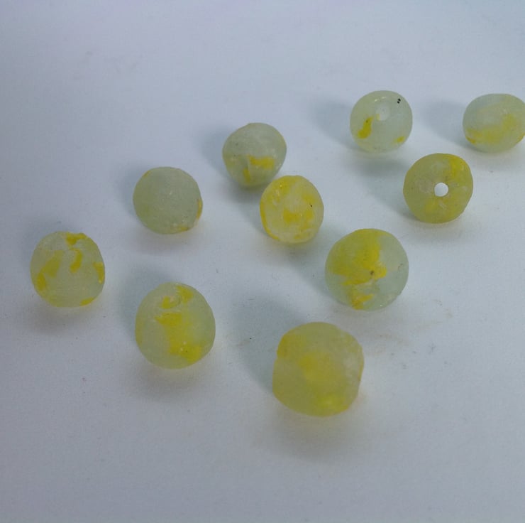 10 traditionally made clear glass beads made from recycled bottles and decorated with yellow glass.