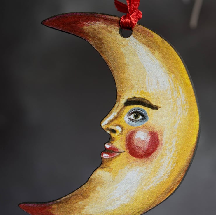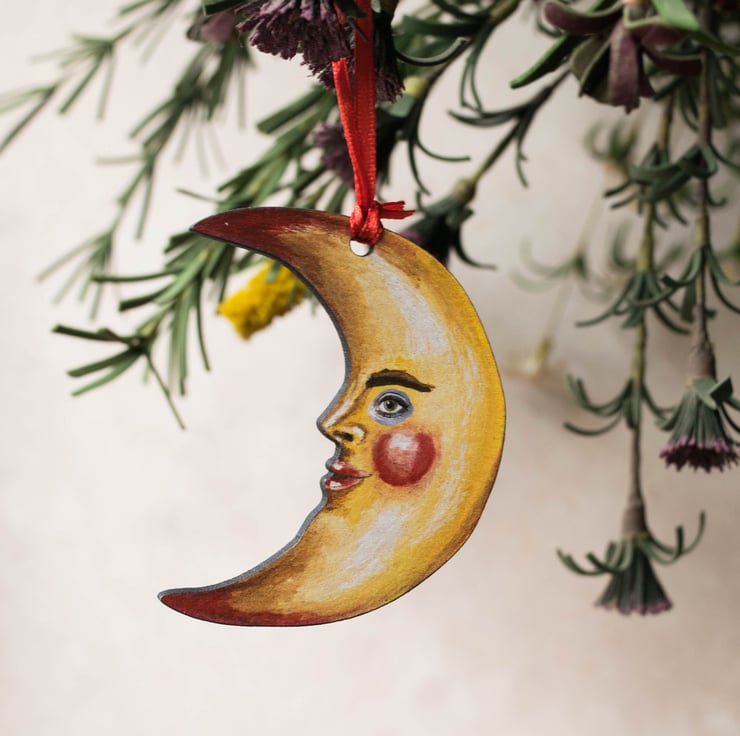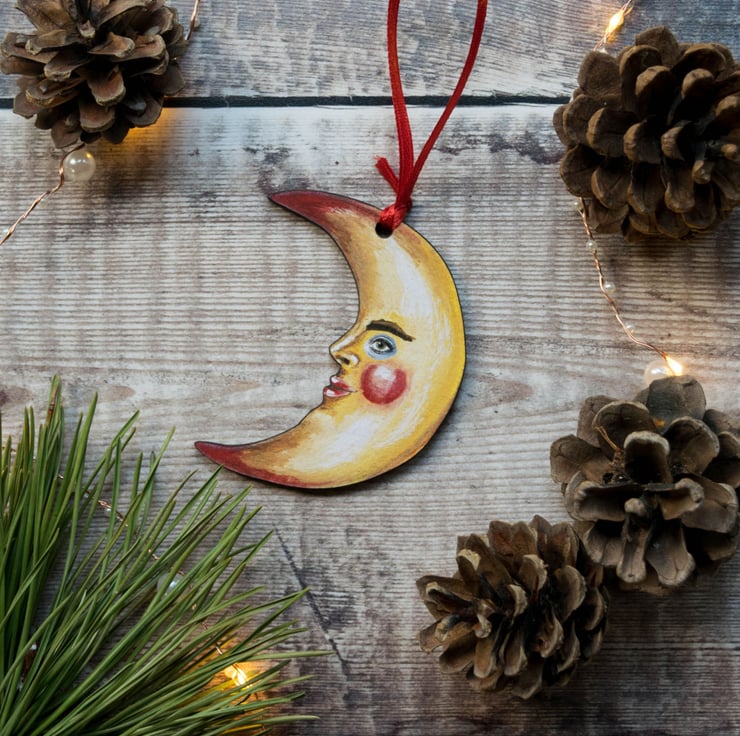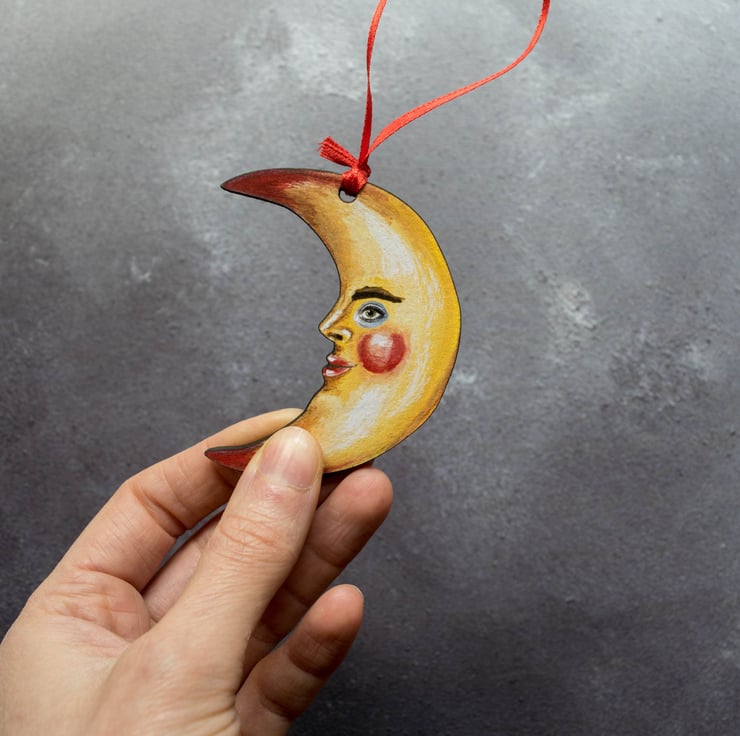 A charming wooden laser cut hanging decoration featuring my illustrated crescent moon man.