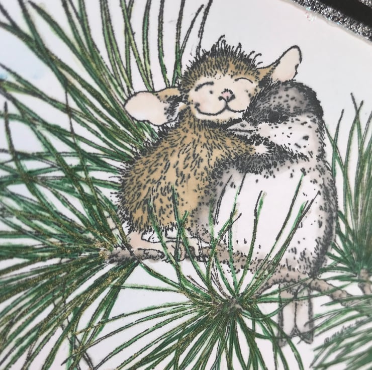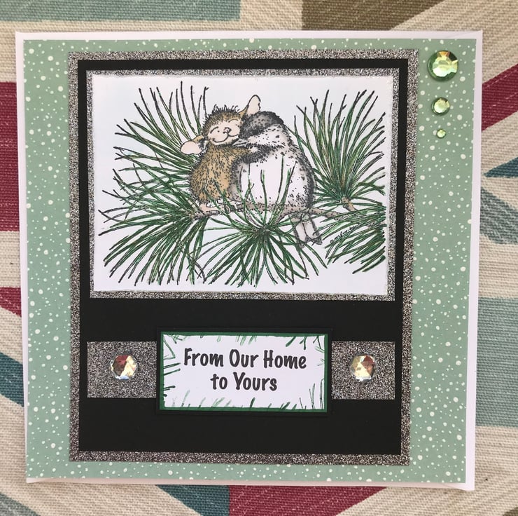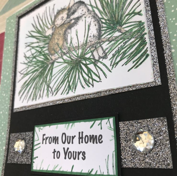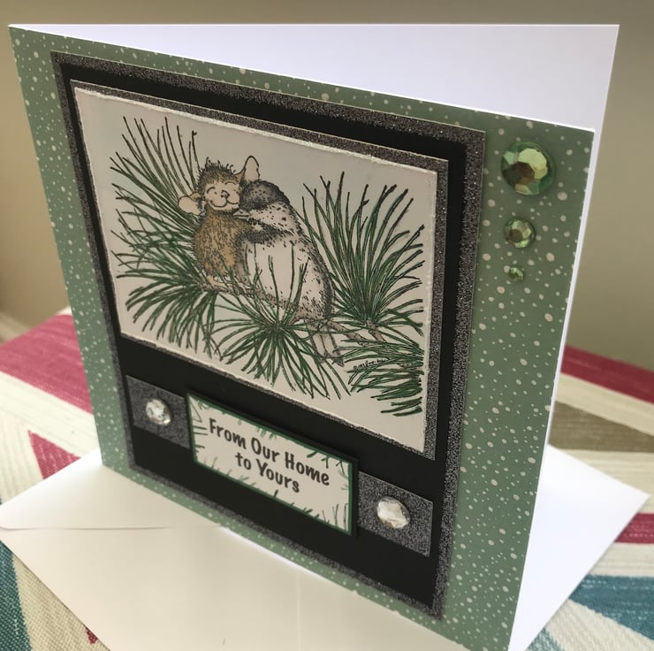 The image is a cute mouse and bird and on the front the sentiment reads From Our Home to Yours.
