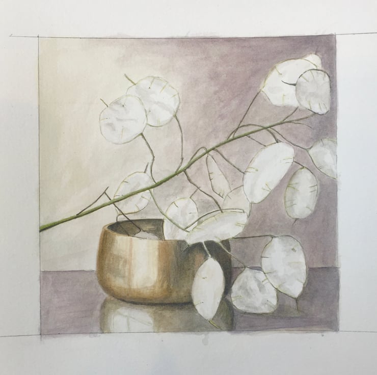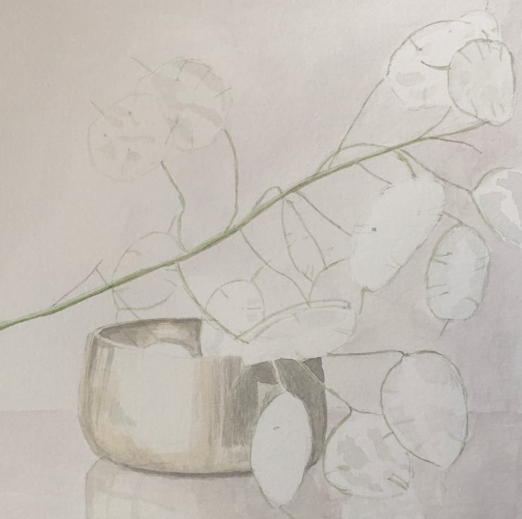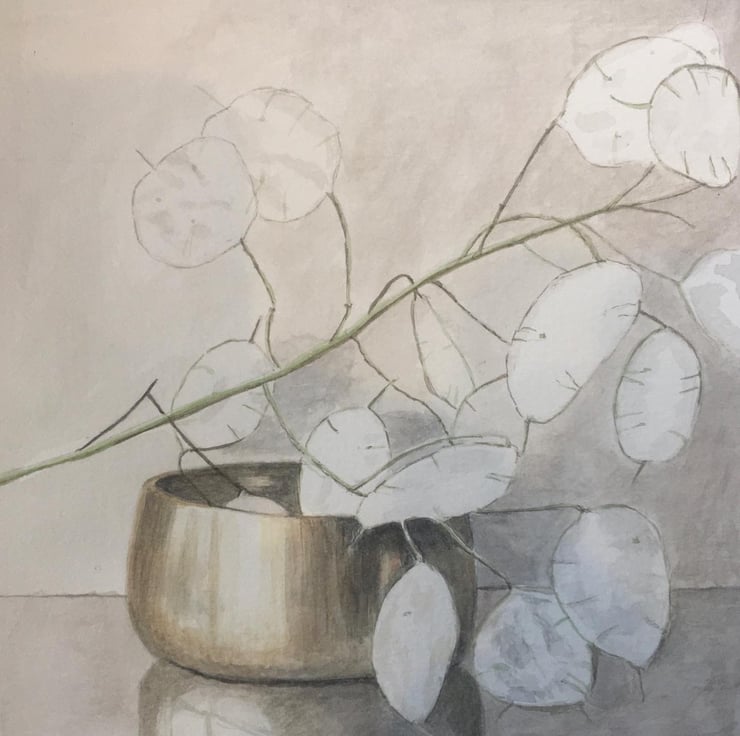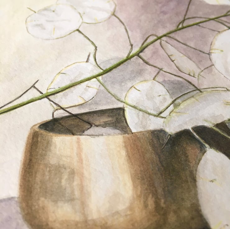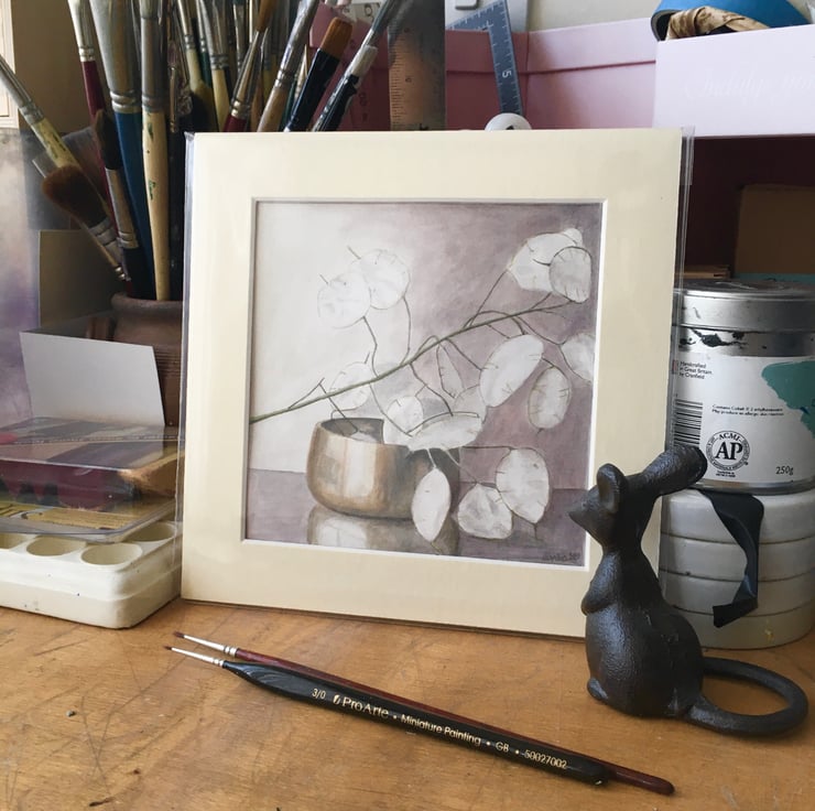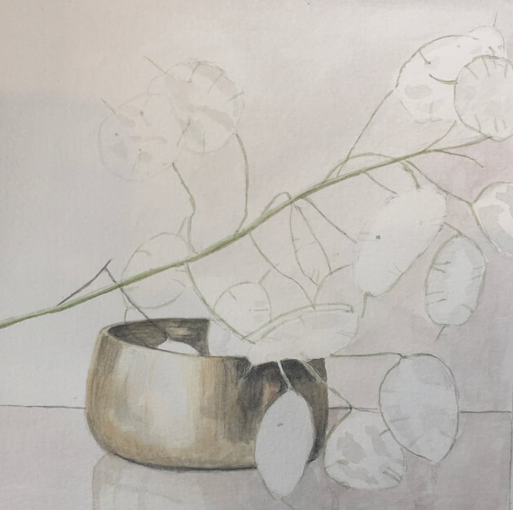 This watercolour still life is of dried honesty and a Himalayan singing bowl. Watercolour on 250 gm2 paper.
