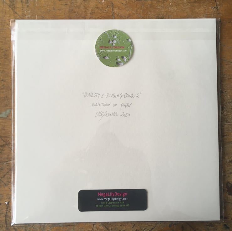The painting is mounted and has a backboard, it will be packaged in a compostable clear bag and a board backed envelope.