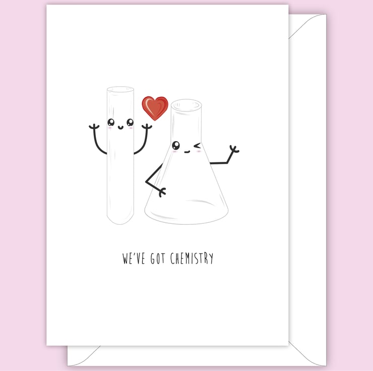 An A6 (folded) anniversary or valentines card made with 350gsm FSC card depicting a hand drawn chemistry flasks, love heart and have happy cartoon style faces. The card is silk coated on the outside to make the image pop and matt on the inside so you can easily write your own message.