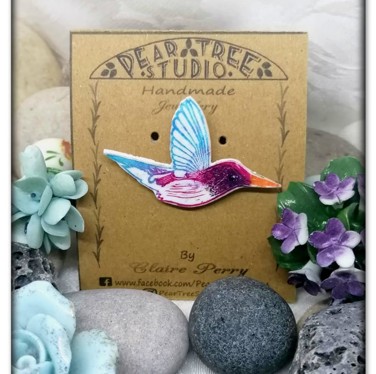 Handmade using one of my Lino cuts for the Print. Hand Printed onto Shrinky Dink plastic. Heated in an oven as a larger print, as the image heats up it then shrinks down to a smaller image and becomes a hard plastic. Varnish added once it has cooled down.